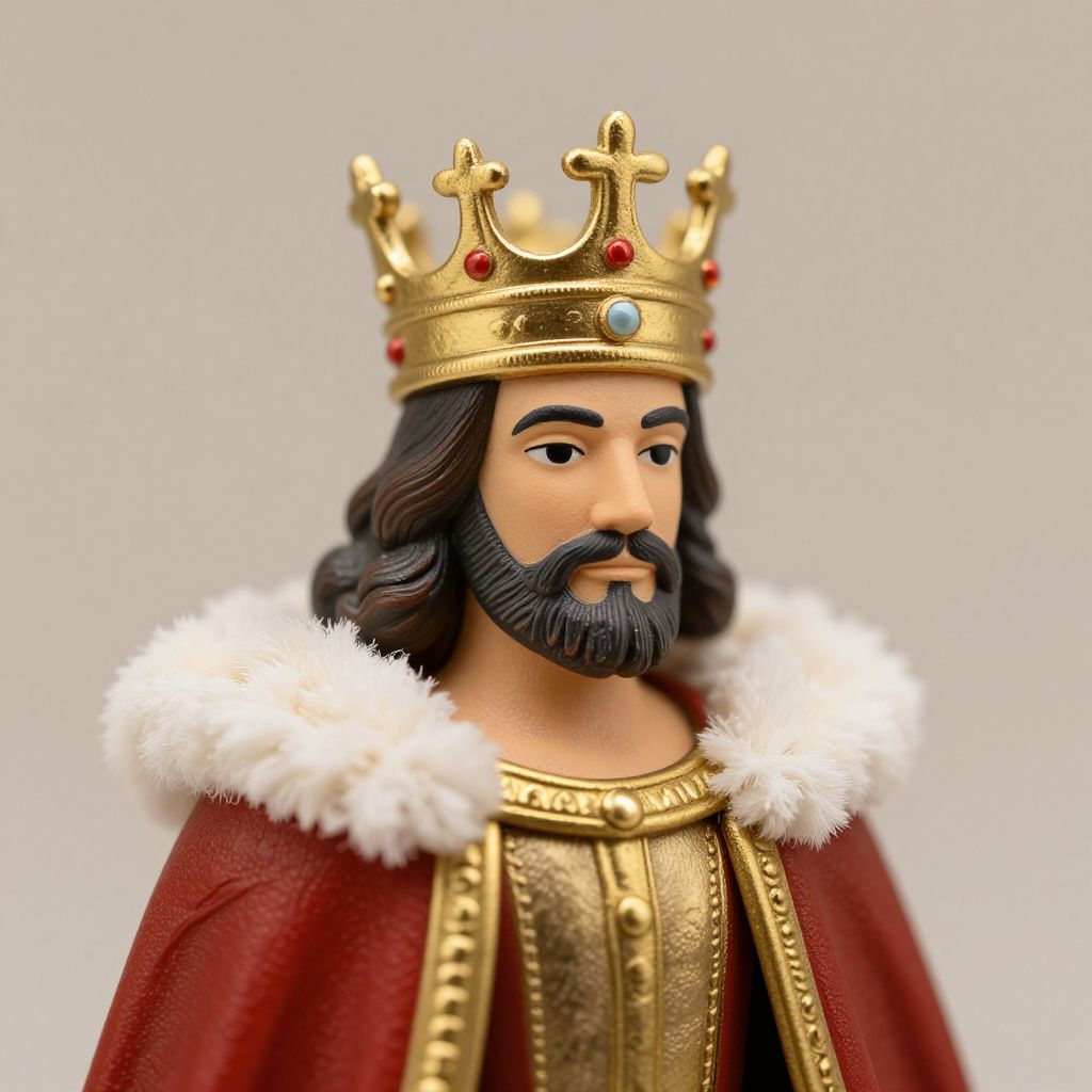 Photograph of a plastic figurine king with a gold crown, red beard, dark wavy hair, wearing a red velvet robe with white fur trim