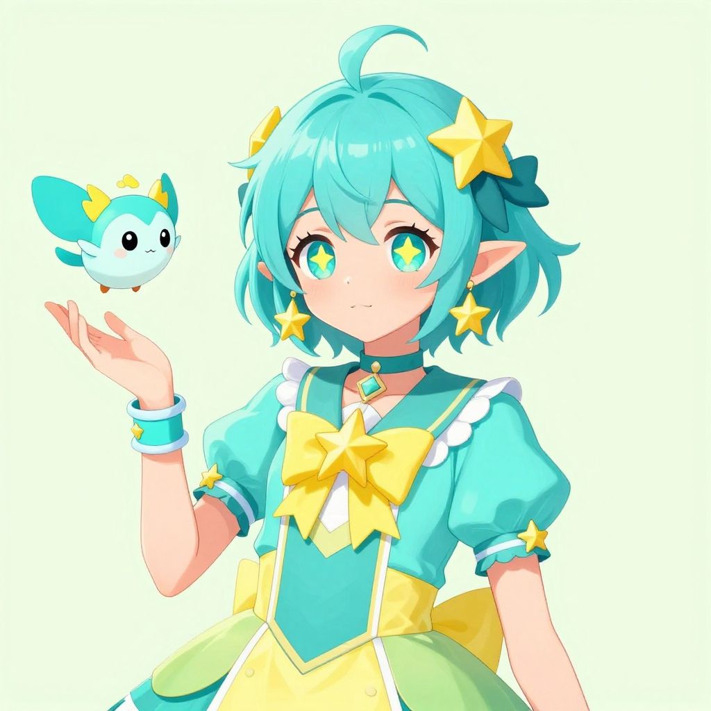 Digital anime-style illustration of a magical girl character with aqua blue hair and star-shaped pupils. She wears a vibrant aqua and yellow outfit featuring puffy short sleeves, a choker, wrist cuffs, and star-themed accessories including star earrings, a star hair ornament, and a large star brooch. The character has pointed elf-like ears and is depicted with a light skin tone, aqua eyes, and a calm expression. An adorable floating magical creature with matching colors is shown near her raised hand. The image has a clean, soft-colored background.