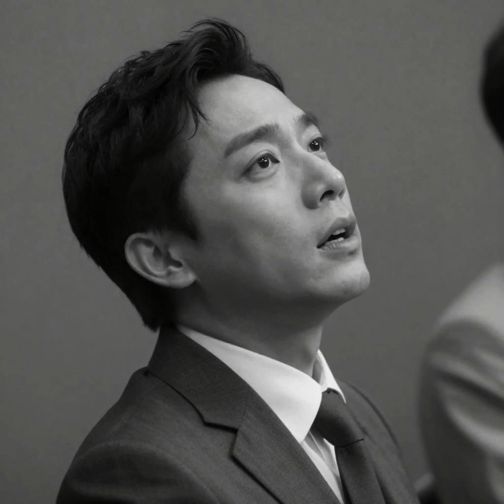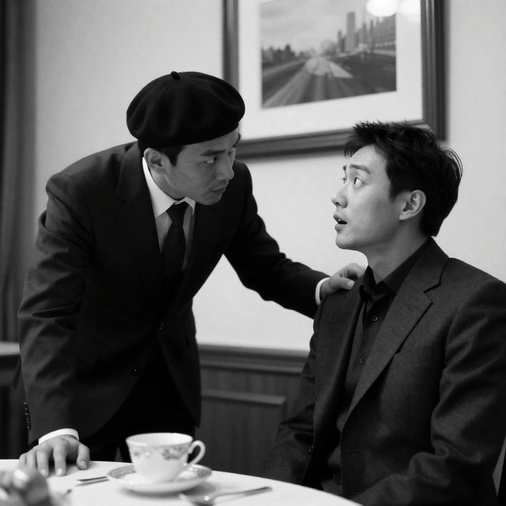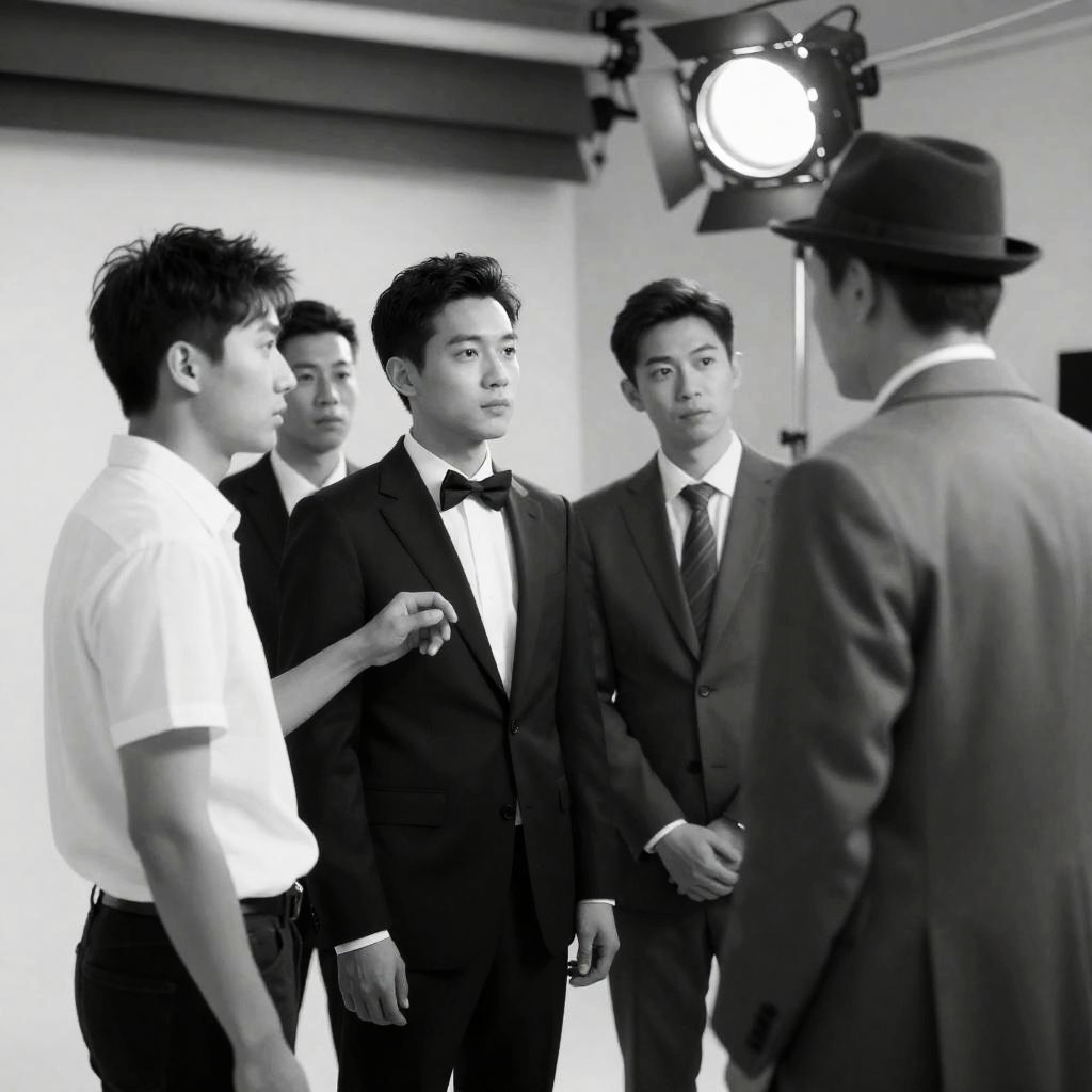 Black and white photograph of five men in a studio. Four men in suits and one in a white shirt. Man in center left with dark suit, white shirt, and bow tie, being adjusted by man in white shirt. Other men in suits look at center left man. Background has studio lights and equipment. Man on far right in fedora and overcoat, facing away. Casual, professional attire. Intense facial expressions. Studio setting.