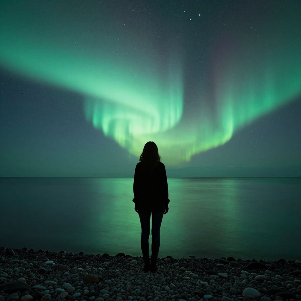 A serene silhouette of a woman stands on a pebbled shore under a starlit sky, her back turned to the viewer as she gazes at the ethereal green aurora dancing above the tranquil waters, evoking a dreamlike, cyberpunk-inspired ambiance with its blend of natural beauty and otherworldly light effects.