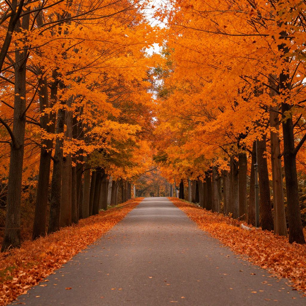 Photograph of a tree-lined autumn road with vibrant orange leaves, fallen leaves on the ground, and a straight, empty path.