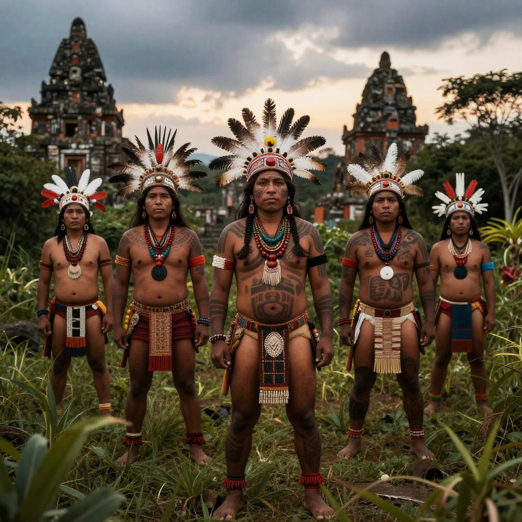 Photograph of four indigenous men in traditional tribal attire with feathered headdresses, tattoos, and colorful bead necklaces, standing in front of ancient temple