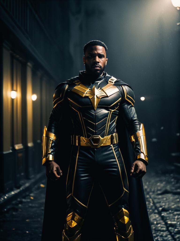 Falcon Superhero Costume, dressed in a black and red costume standing in front of a building --sref 1390