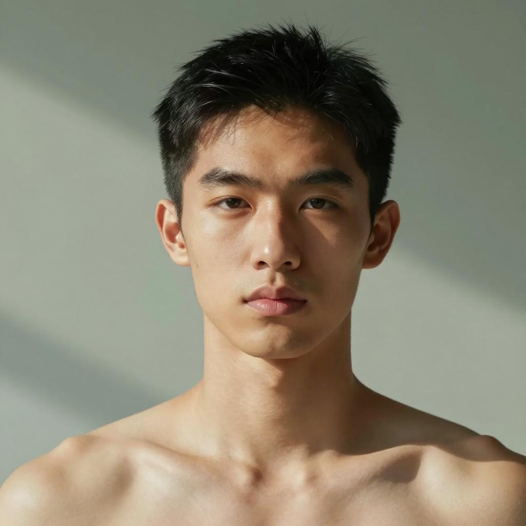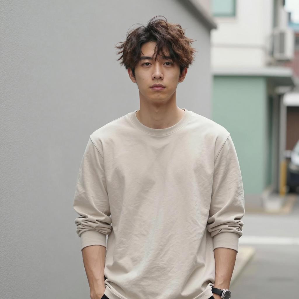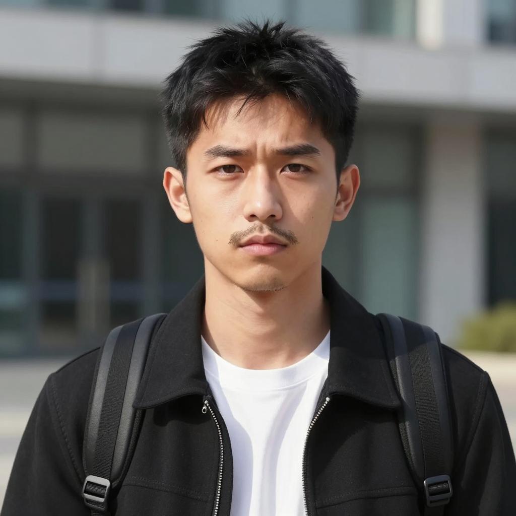 Photorealistic medium close-up portrait of a young Asian man with short black hair and a mustache, wearing a black jacket over a white shirt and carrying a backpack. He has a serious expression and is photographed outdoors in a modern urban environment under soft daylight with a blurred green and gray background.
