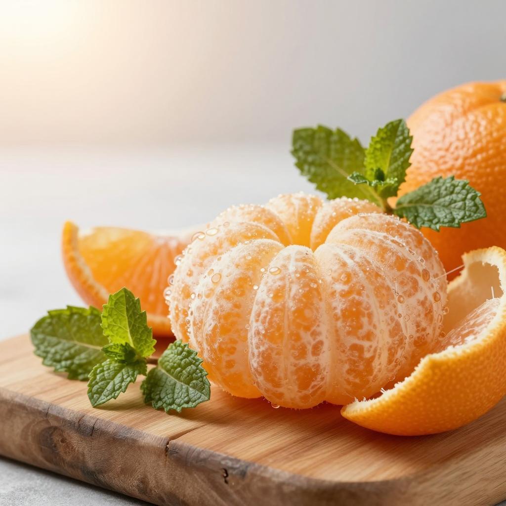 Macro close-up of freshly peeled citrus fruits with mint leaves on weathered wooden cutting board under warm golden hour backlight, 8K resolution, minimalistic, bright, authentic, healthy, vibrant, photorealistic.