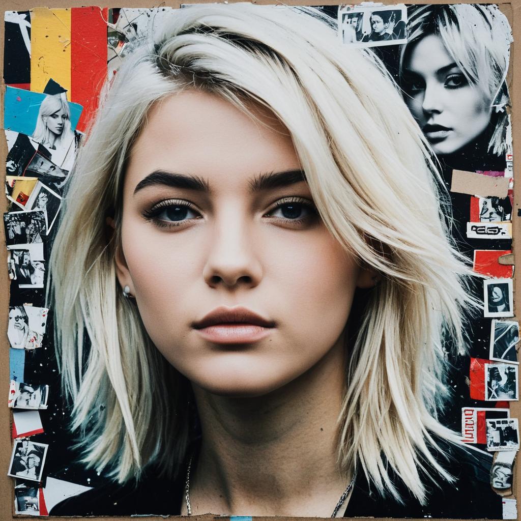 Teenager, with platinum blonde hair, in the style of multi-layered collages, edgy street art, celebrity-portraits, cardboard, fragmented icons, realistic hyper-detail, crossed colors