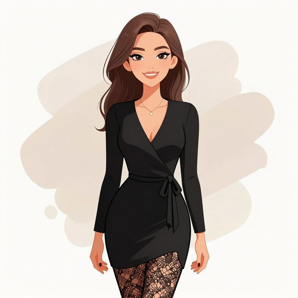 This is a digital anime-style illustration of a smiling woman with long, dark brown hair and fair skin. She is wearing a black, long-sleeved, V-neck dress that ties at the waist, accentuating her slim figure. Her legs are covered in black lace stockings. She has large, expressive brown eyes, a small nose, and full lips. She wears a delicate gold necklace with a small pendant. The background is a simple, light beige color with no distinct objects or patterns. The overall style is clean and modern, with bold lines and vibrant colors.