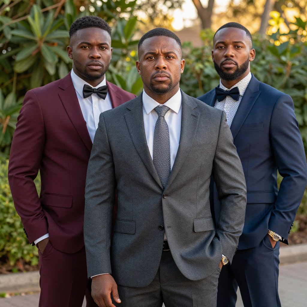 A group of big black buff oily men posing outdoors at sunset, golden light reflecting on their shiny skin, muscular physiques with detailed anatomy, surrounded by natural elements like trees and rocks, cinematic and powerful atmosphere.