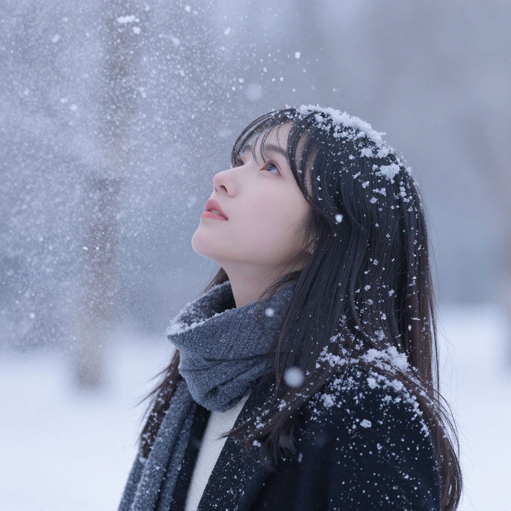 Photograph of an Asian woman with pale skin and long, straight black hair, standing outdoors in a snowy landscape. She wears a thick, gray scarf and a black coat, with snowflakes visibly falling around her. Her head is slightly tilted upwards, and she gazes into the distance, her lips slightly parted. Snowflakes rest on her hair and scarf, and the background is blurred with white and gray tones, indicating a snowy, wintry environment. The overall mood is serene and contemplative, capturing the quiet beauty of a snowfall.