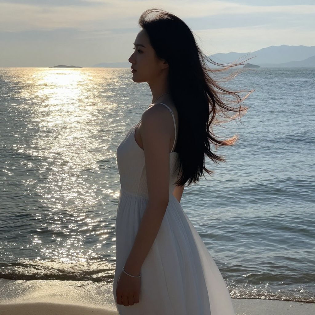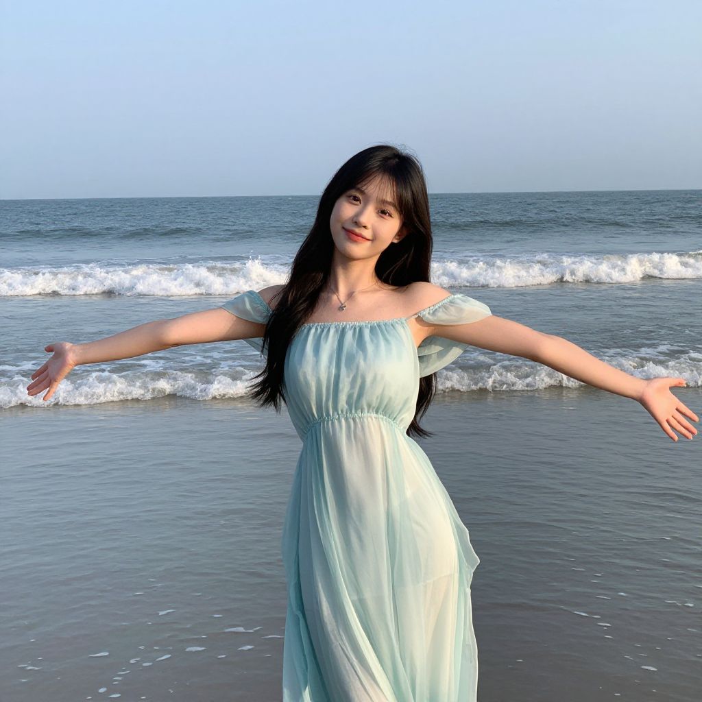 Young woman standing by the ocean, arms outstretched, wearing a flowing off-the-shoulder dress as waves gently lap the shore behind her.