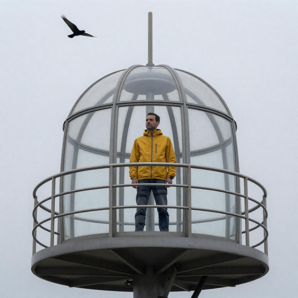 Photograph of a man in a yellow jacket standing on a circular, glass-enclosed observation tower with a metal railing. He has short dark hair and a neutral expression. A bird flies in the cloudy sky above. The tower has a dome-shaped roof. The man is centered, looking slightly to the right.