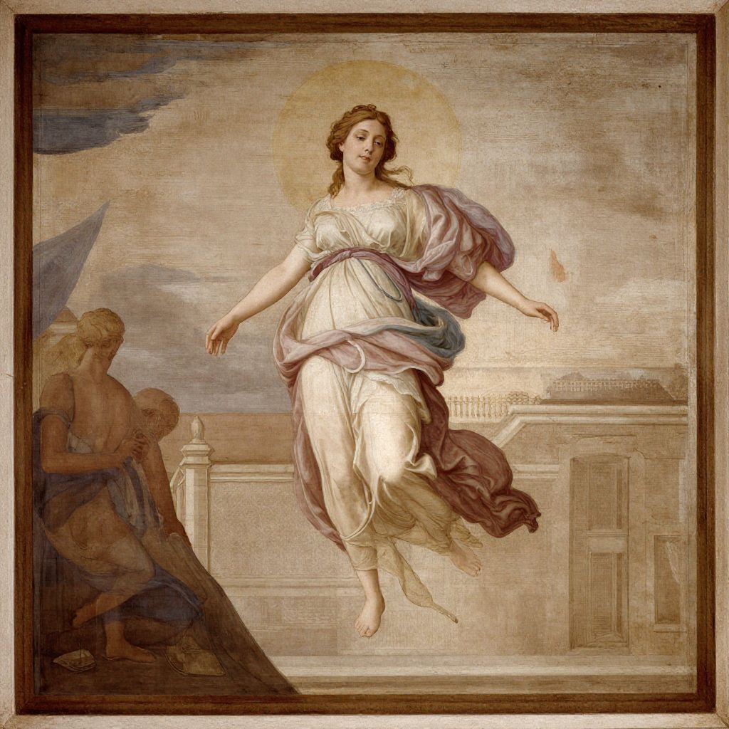 A baroque-style fresco depicts a beautiful woman in a flowing dress, levitating in a sepia-toned, dramatic scene.