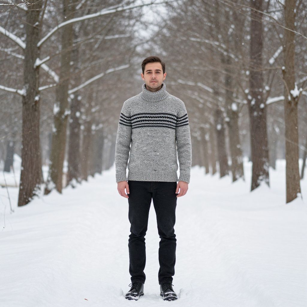 "Sweater Man Winter, man in a sweater standing in a snowy forest"