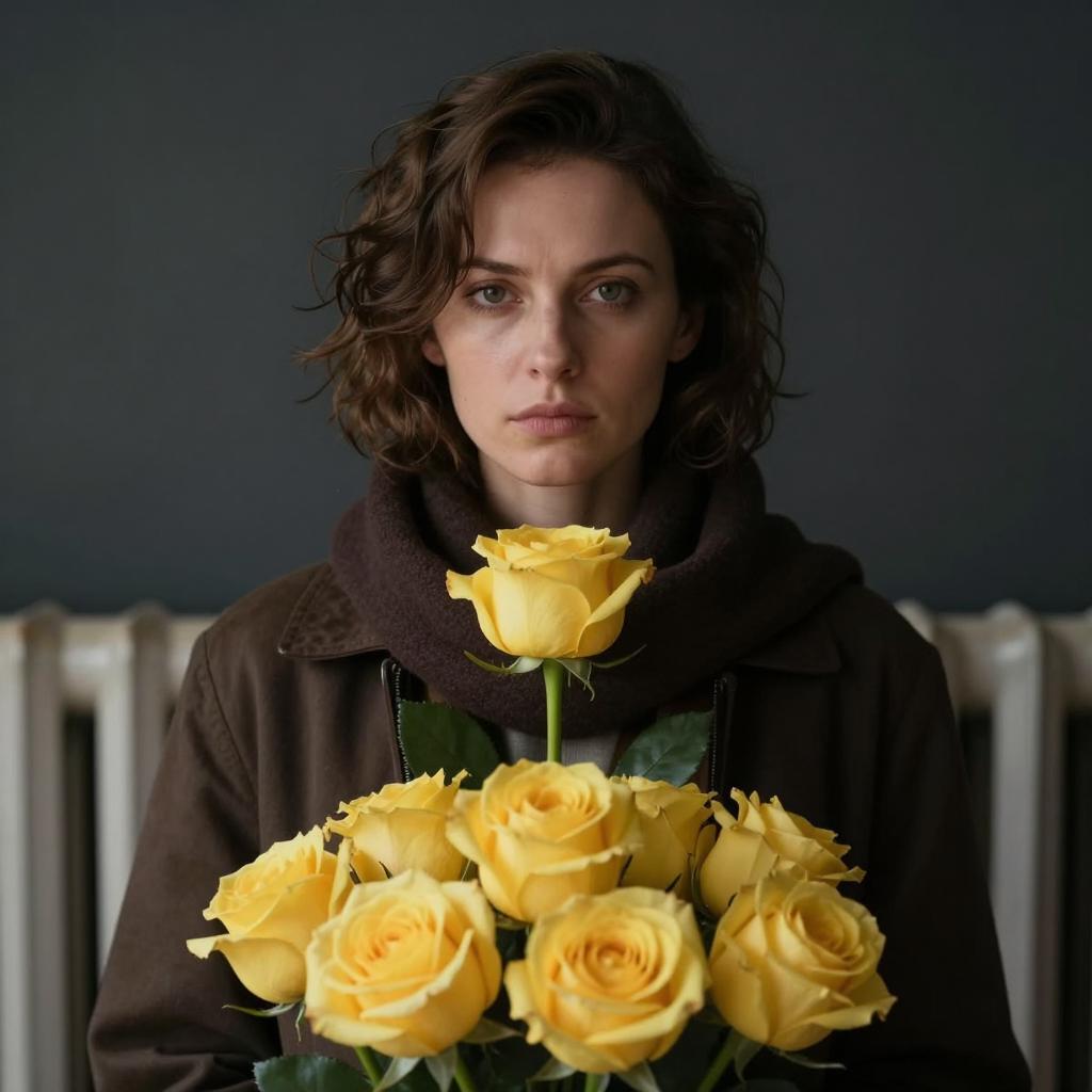Woman with short, wavy brown hair, wearing a dark brown scarf and jacket, holds a yellow rose in front of a dark background with an old radiator. Bright yellow roses in the foreground. Dim lighting. Serious expression. One person.