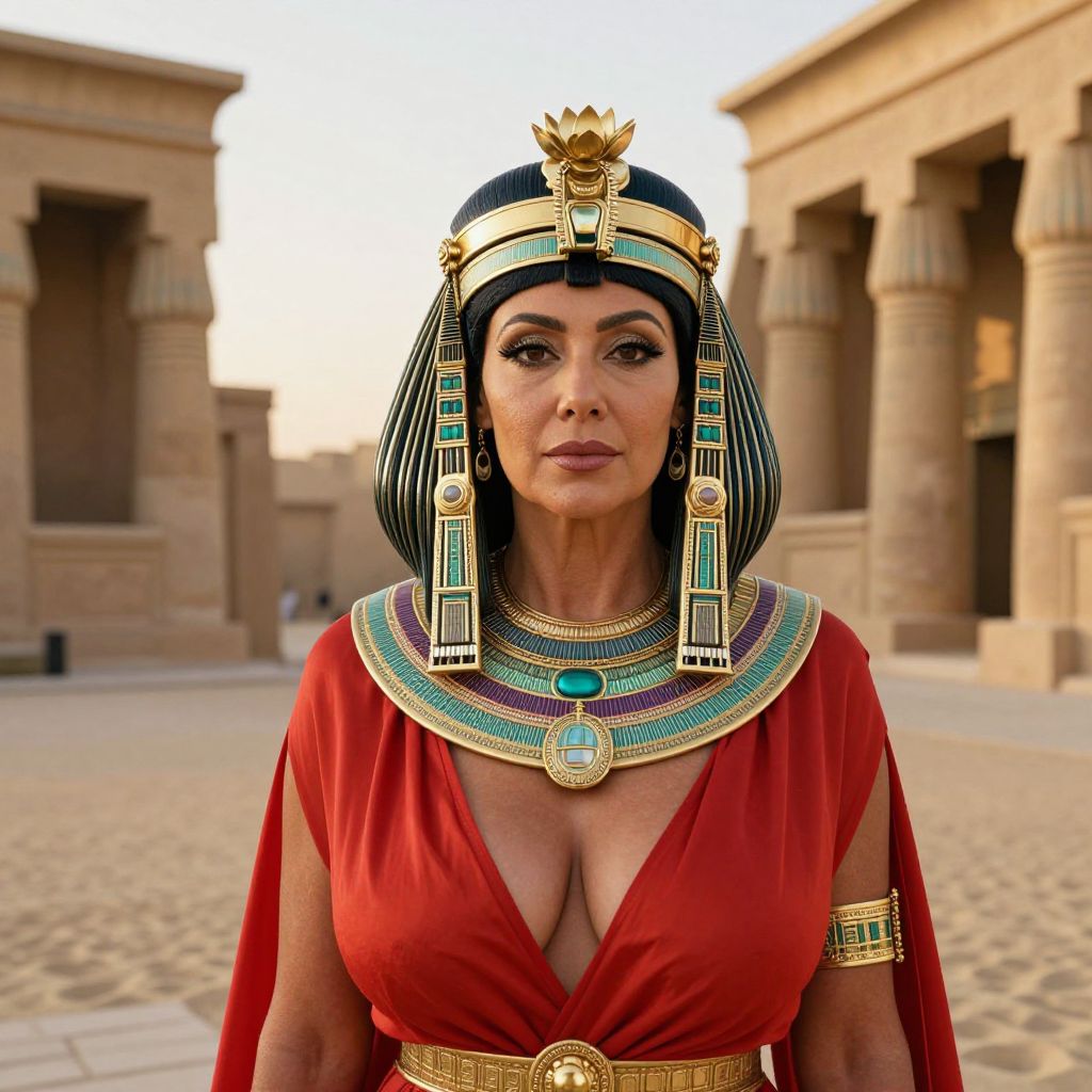 A realistic photograph of a mature woman dressed as Queen Cleopatra in an elaborate ancient Egyptian costume, featuring a vibrant red sari-like robe, gold jewelry, false hair decorated with intricate plaques, and a crown with lotus flowers, standing in a sun-drenched Egyptian temple at sunset with golden sand and columned architecture in the background, her face is smooth, with deep brown eyes, full lips, and a regal expression, looking directly at the camera.. The woman has big tits and cute face