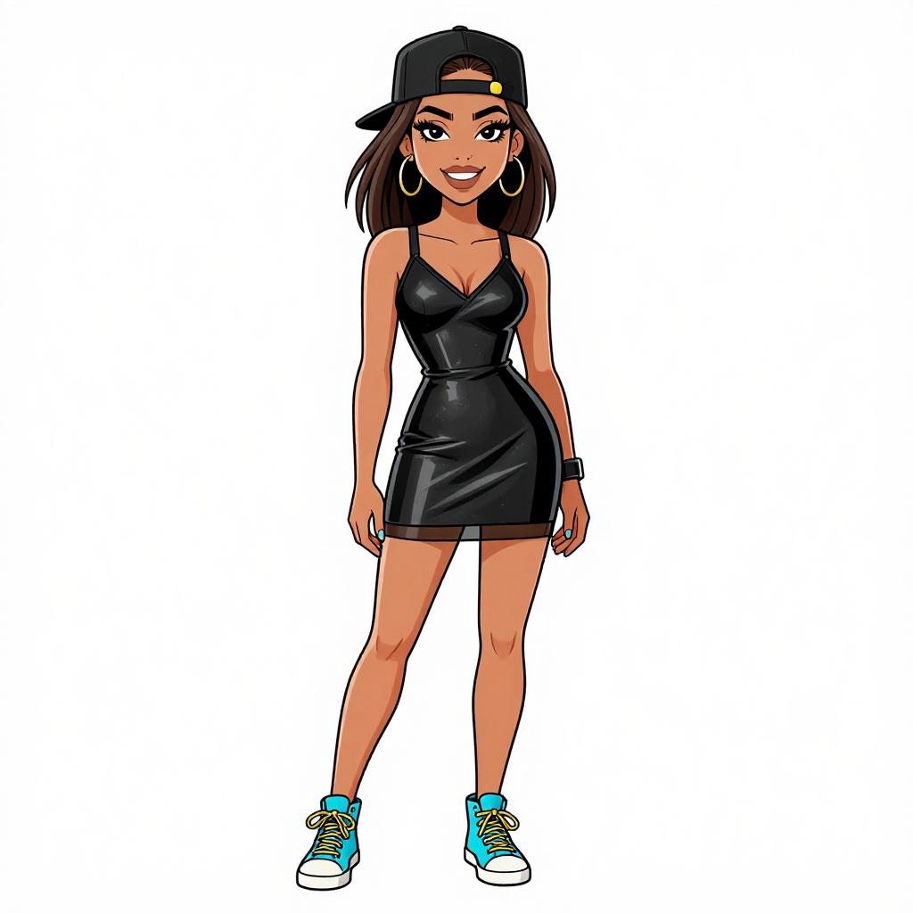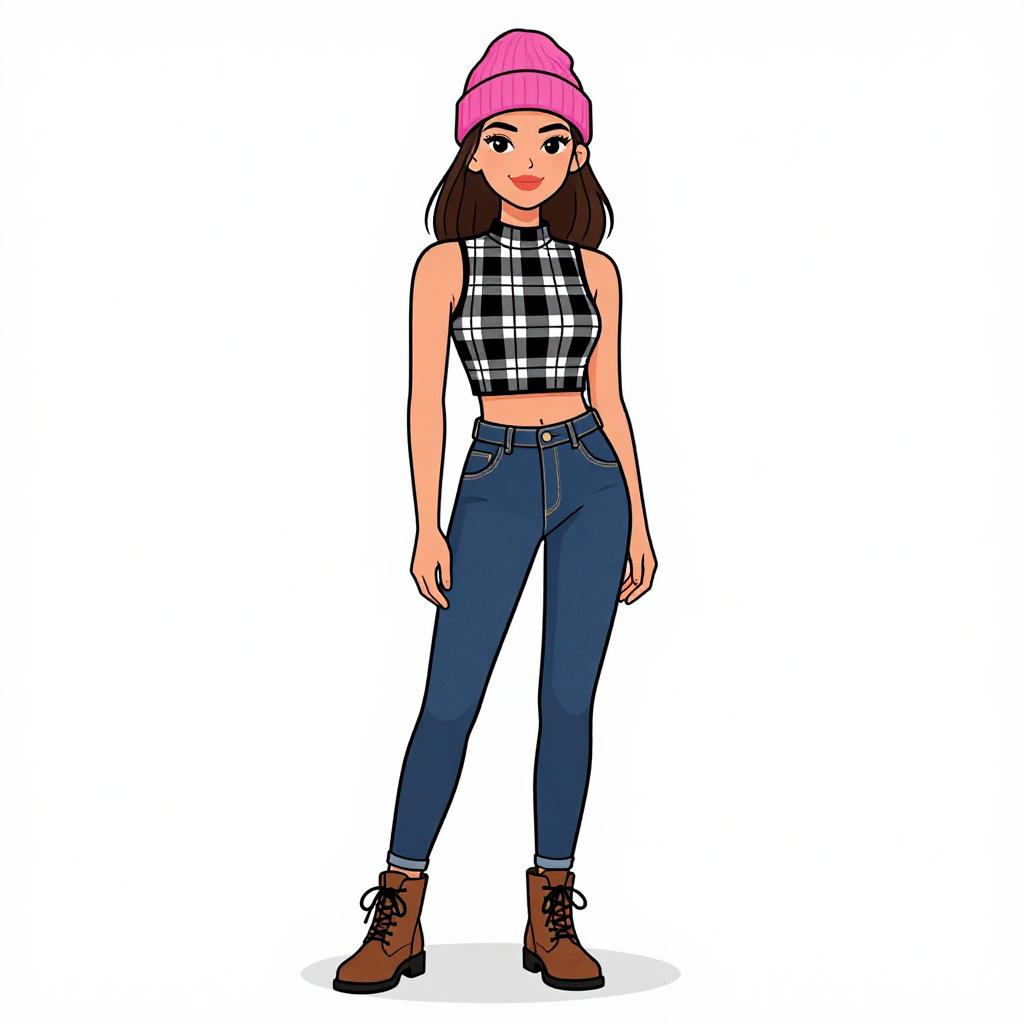 Woman with pretty face and pretty hair. smiling Woman, urban street style, black sleeveless loose top, vibrant fish print leggings, claret red ankle boots with block heels, black beanie with white text, white background. --sref 1467