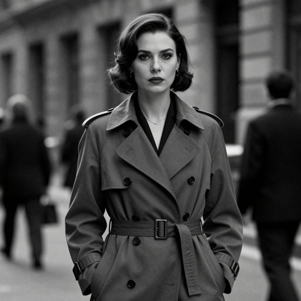 A black-and-white photograph depicts a confident woman with short, wavy dark hair and dark lipstick, standing in an urban street. She wears a belted, double-breasted trench coat with her hands in her pockets. Her expression is serious and composed. The background is blurred, showing indistinct figures and stone buildings, adding a sense of depth and focus on the subject. The photograph has a high-contrast, dramatic style, emphasizing the textures of her coat and the cityscape. The overall mood is moody and sophisticated.