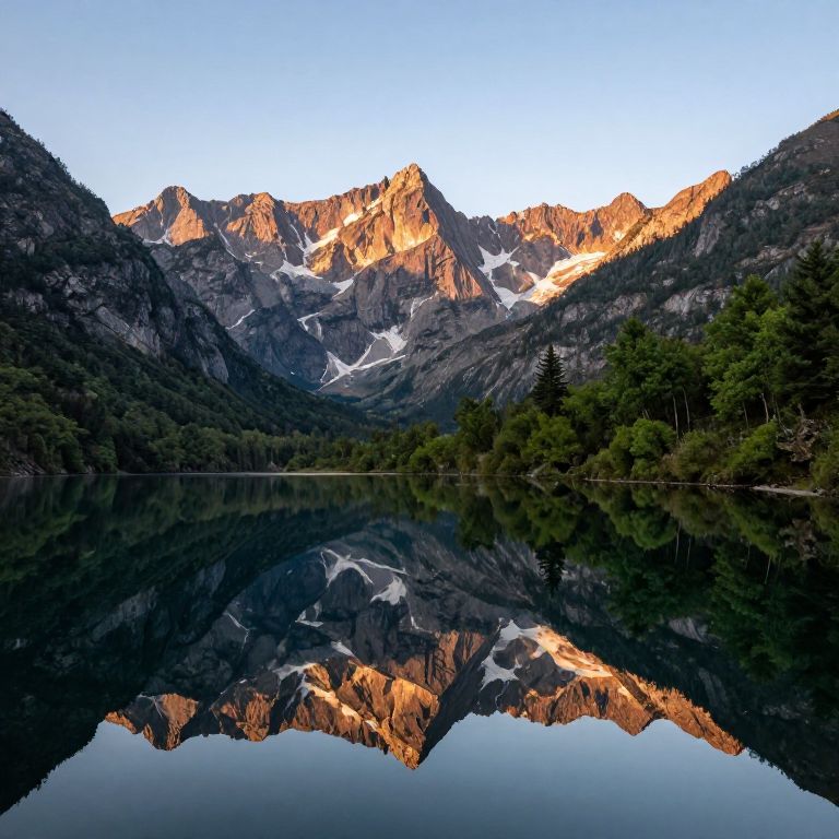 Calm waters mirror the majestic peaks and verdant trees, creating a serene reflection that blends the rugged mountains with the tranquil sky above.