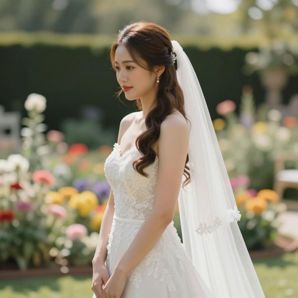 White wedding guest dress, photograph of an Asian bride, long brown hair in a loose updo, white lace strapless wedding dress, long white veil, soft makeup, red lipstick, standing in a garden, colorful flowers in background, sunlight, bokeh effect, side profile, soft focus, summer day, realistic style