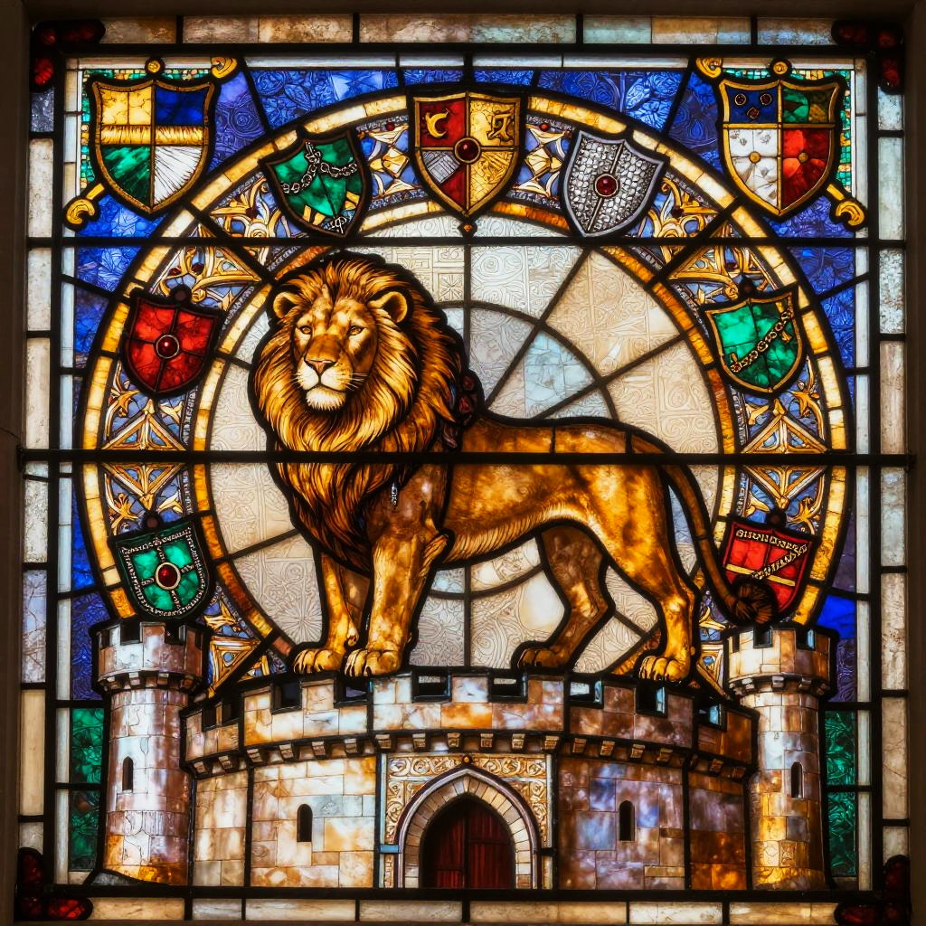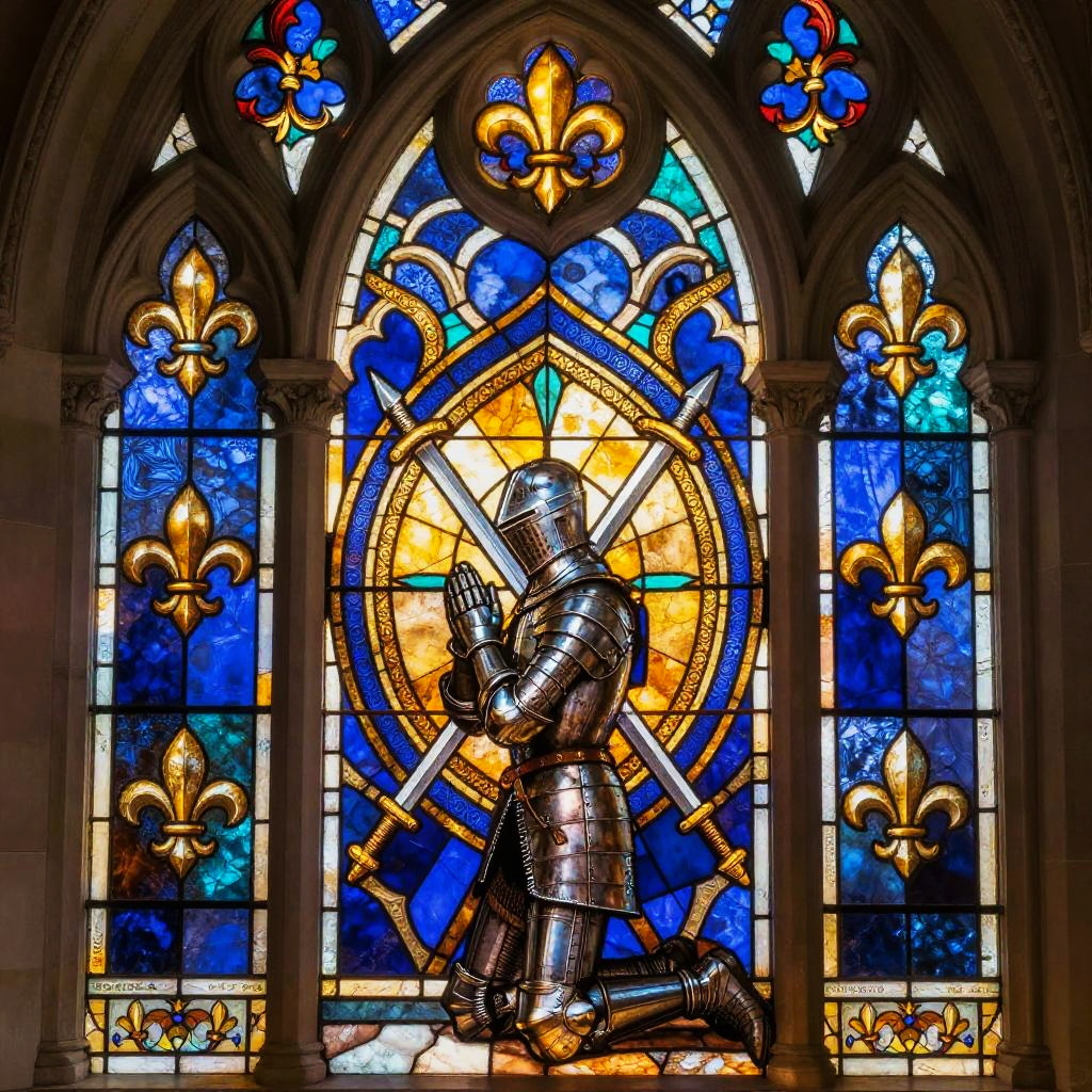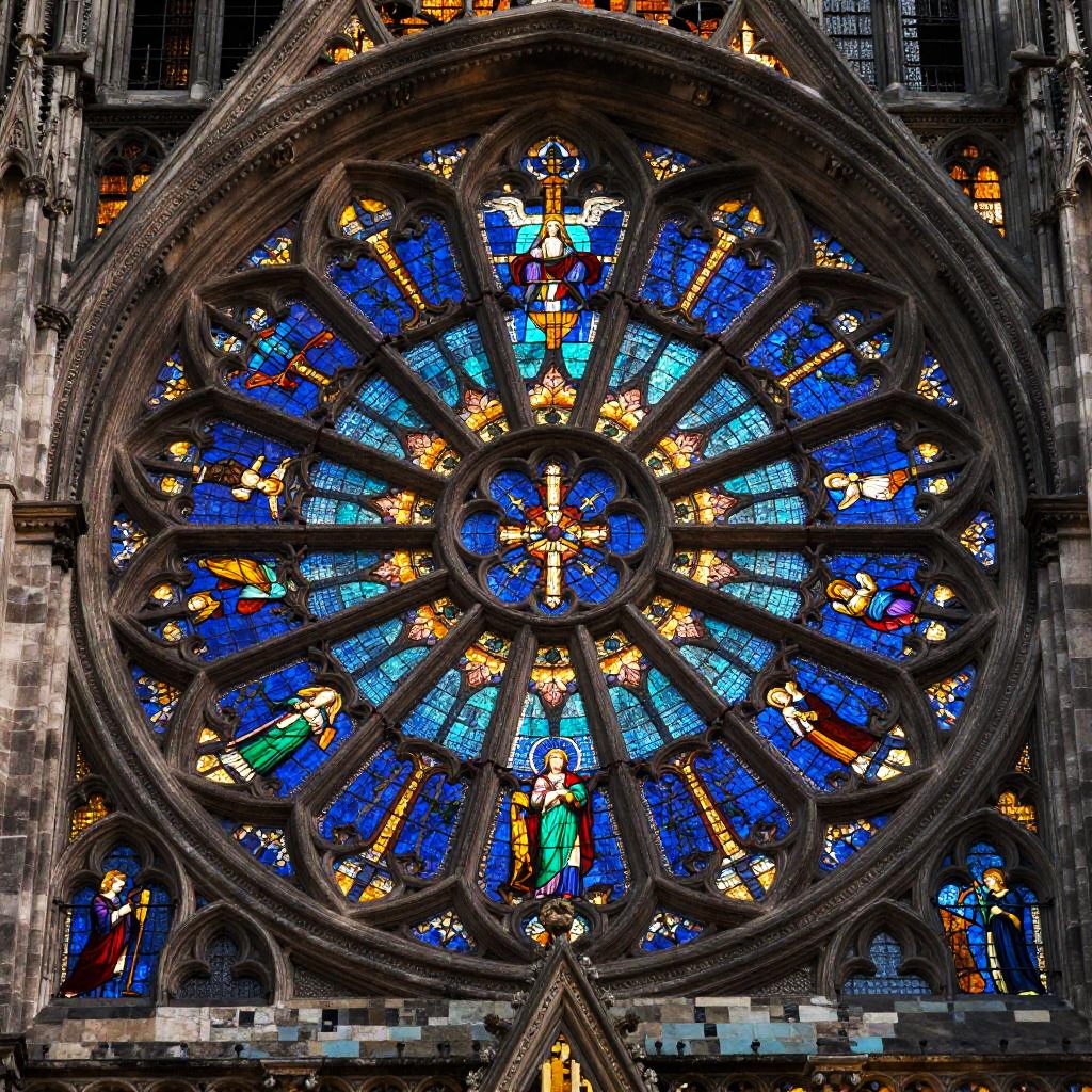 A vibrant Renaissance-style stained glass with painterly shading depiction of a Angelic guardian figure clothed in white robes with golden halo, centered and ceremonial. Symmetrical roses and fleur-de-lis patterns radiate in ornate geometry and fine filigree. Warm amber backlight, lapis and turquoise accents, gilded highlights. Crisp linework, intricate micro-patterns, balanced negative space, soft vignette, high resolution, poster-ready, mesmerizing rhythm, opulent yet serene.