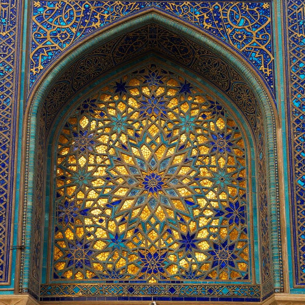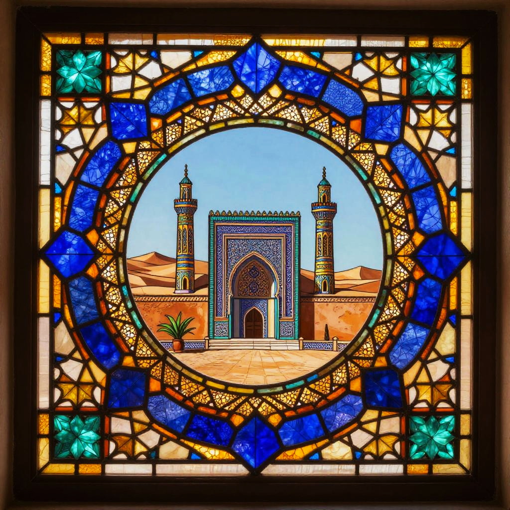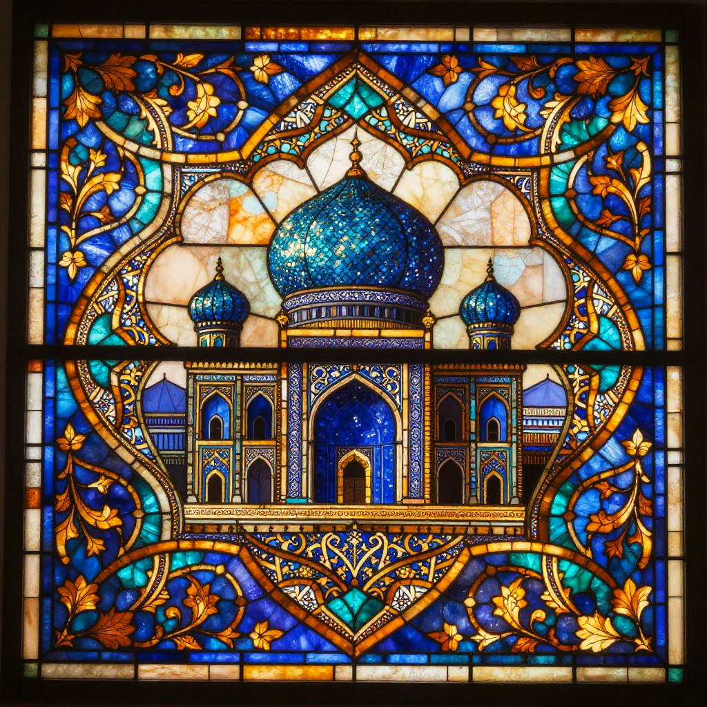 A vibrant Renaissance-style stained glass with painterly shading depiction of a Angelic guardian figure clothed in white robes with golden halo, centered and ceremonial. Symmetrical roses and fleur-de-lis patterns radiate in ornate geometry and fine filigree. Warm amber backlight, lapis and turquoise accents, gilded highlights. Crisp linework, intricate micro-patterns, balanced negative space, soft vignette, high resolution, poster-ready, mesmerizing rhythm, opulent yet serene.