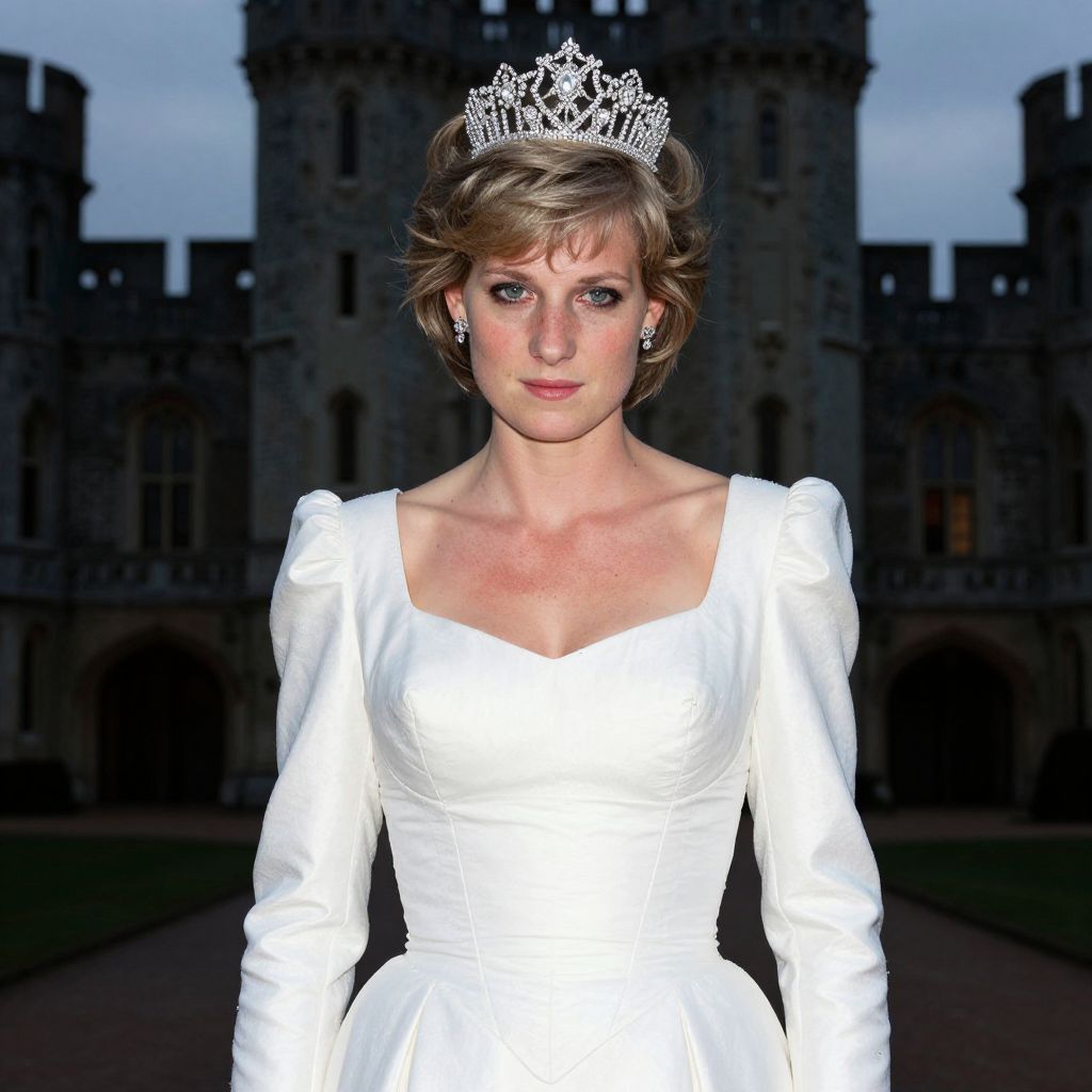 A dramatic portrait of a woman in a highly detailed princess Diana costume standing in front of a royal castle facade at twilight, dressed in the full white gown and tiara, her face has a soft, serious expression, eyes slightly downcast, emphasizing elegance and historical regalia in a realistic photographic style. The woman has big breasts and cute face