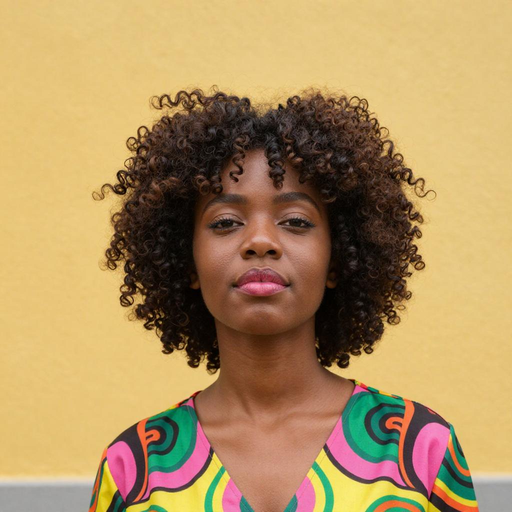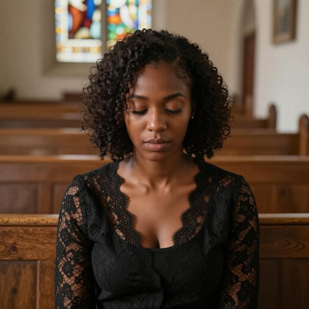 Photograph of a beautiful Black woman with curly hair, wearing a black lace top, sitting in a dimly lit church. She's centered in the frame, looking down with closed eyes. The wooden pews and stained glass windows are in the background, slightly blurred. The lighting is soft and warm, creating a serene atmosphere. The camera angle is eye-level, with a shallow depth of field focusing on her face.
