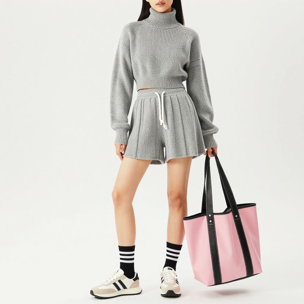 Photograph of an Asian woman with long black hair, wearing a gray, ribbed, long-sleeve sweater and matching high-waisted shorts with a drawstring. She has white sneakers with black stripes and black-and-white striped socks. She holds a pink and black tote bag in her right hand. The background is plain white, making her outfit and accessories the focal point. The texture of her sweater and shorts is ribbed, and the tote bag has a smooth, shiny surface. The overall style is casual and sporty.