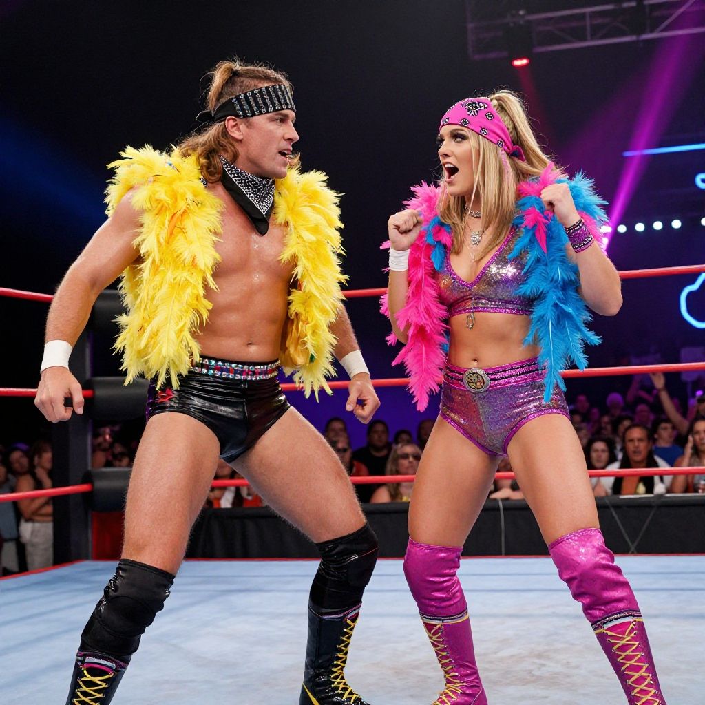 Macho man and Elizabeth costumes, detailed retro wrestling attire, bold reds and blues with gold embellishments, dramatic spotlight on costumes, vintage wrestling ring setting, textured fabric, vivid colors, cinematic atmosphere