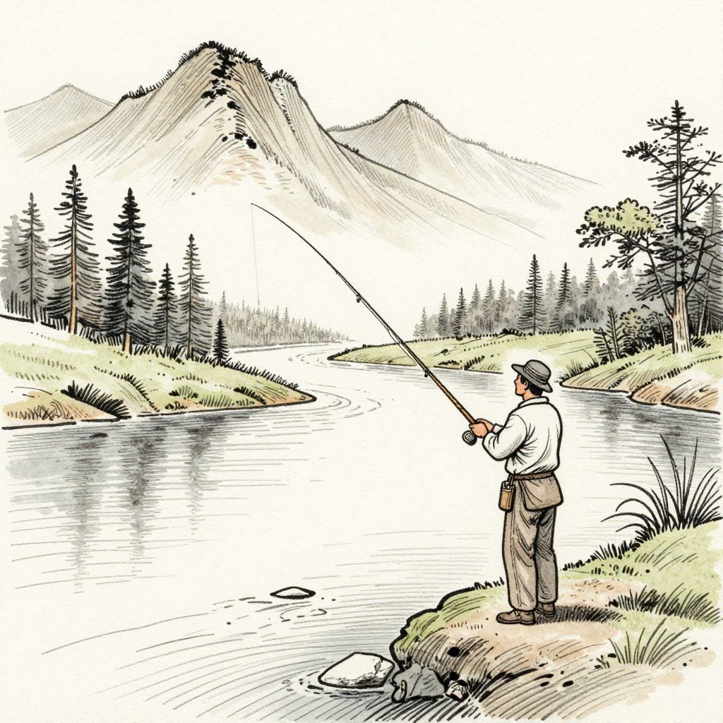 A detailed, black-and-white digital drawing depicts a man standing on a grassy riverbank, fishing. He wears a white shirt, brown pants, and a hat, holding a fishing rod with both hands. The river curves through the foreground, reflecting the surrounding landscape. Tall pine trees line the riverbanks, and a prominent, jagged mountain rises in the background. The man is positioned on the right, facing the water. The scene is serene with a reflective, calm water surface. The drawing uses bold lines and minimal shading to create a sense of depth and realism.