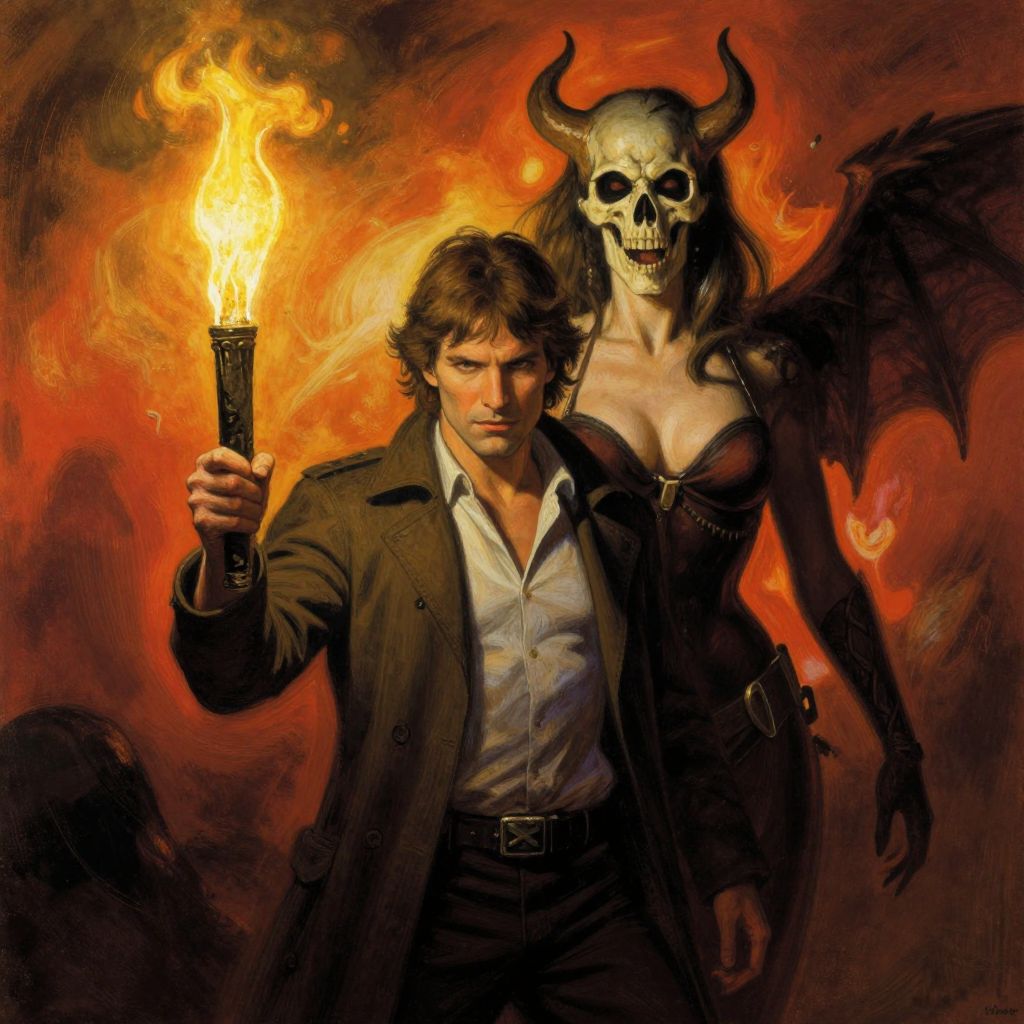 A man holding a torch stands in front of a woman and a demonic skull, with a fiery background, reminiscent of Frank Frazetta's style.