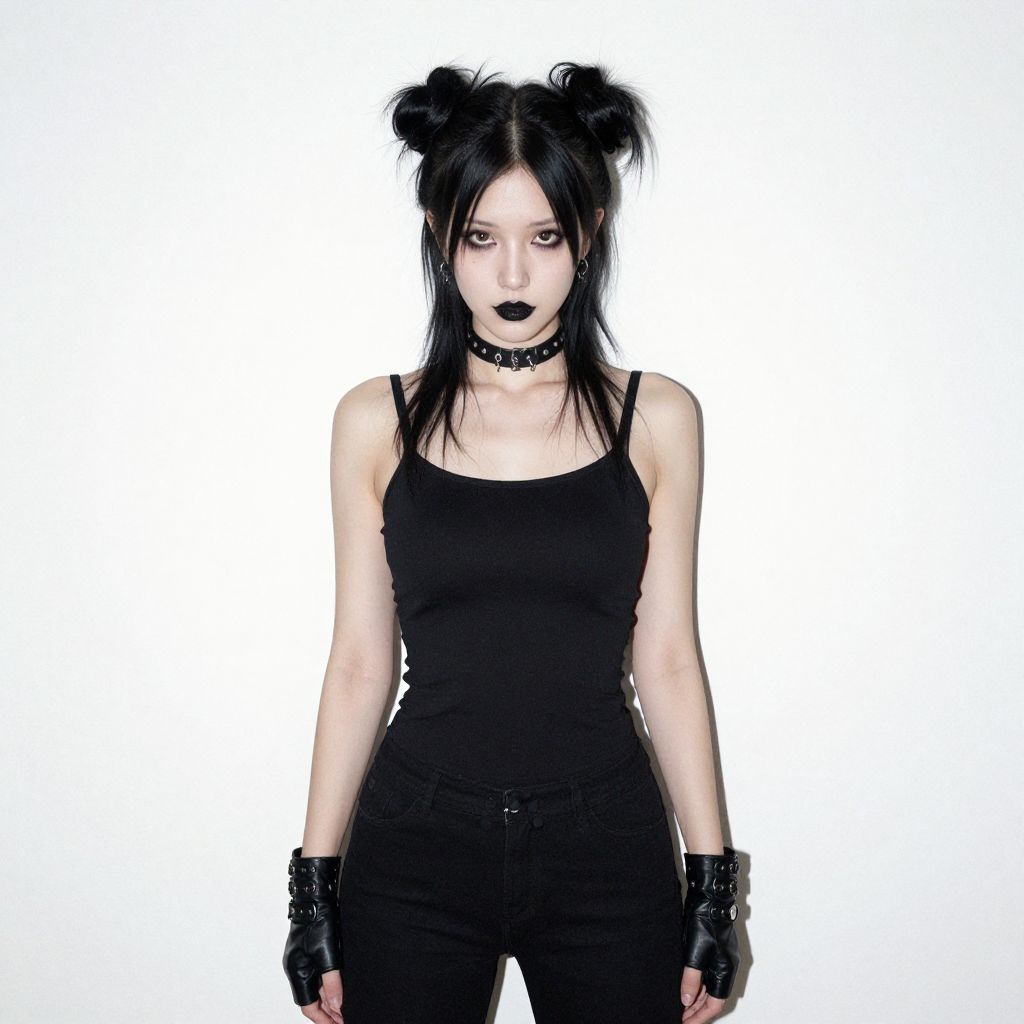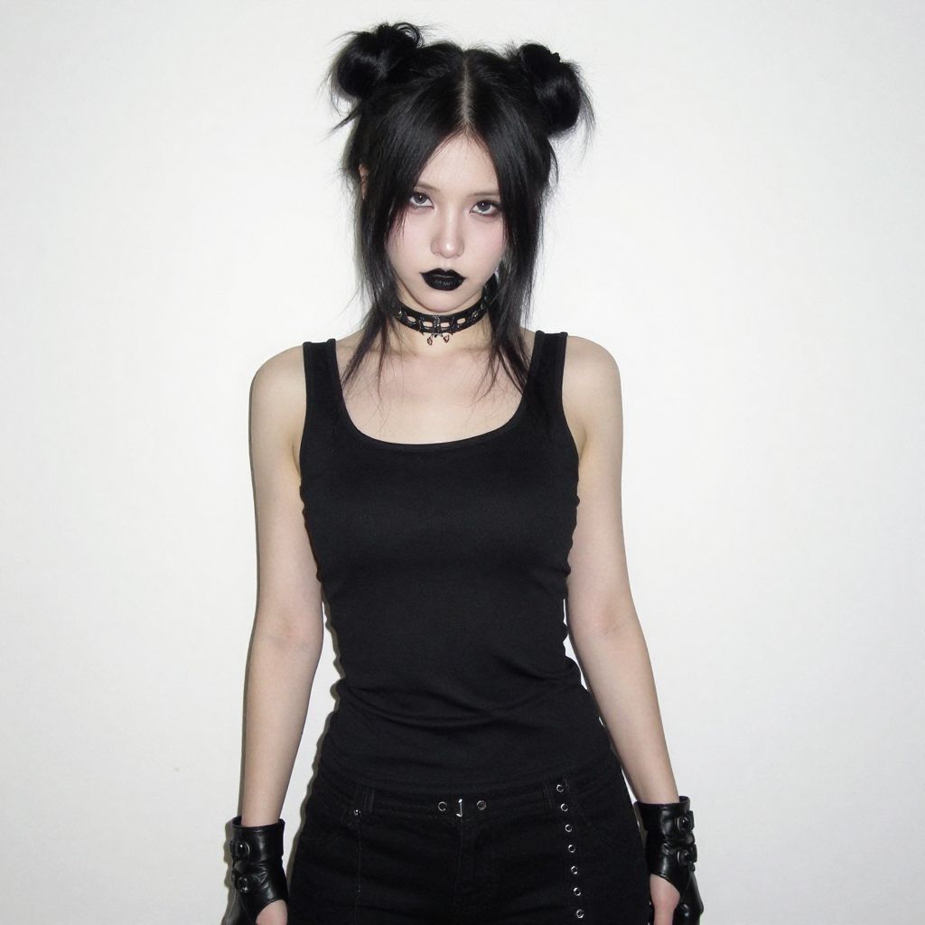 Photograph of a pale-skinned woman with black hair in two buns, wearing a black choker, sleeveless black top, black fingerless gloves, and black pants. Her makeup is dark with black lipstick. The background is plain white, making her and her goth-inspired outfit stand out starkly. The image has a slightly grainy, vintage digital filter.