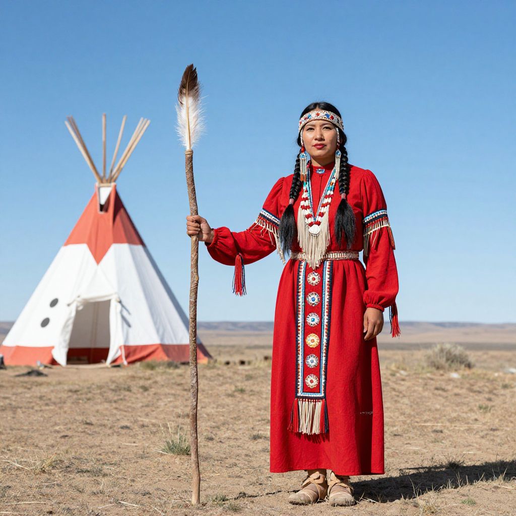 Native American woman standing in a desert landscape, adorned in traditional Sioux attire featuring a vibrant red dress with intricate beadwork, fringed accessories, and a feathered headdress, while holding a staff with a large feathered tip, with a white and red tipi structure visible in the background under a clear blue sky.