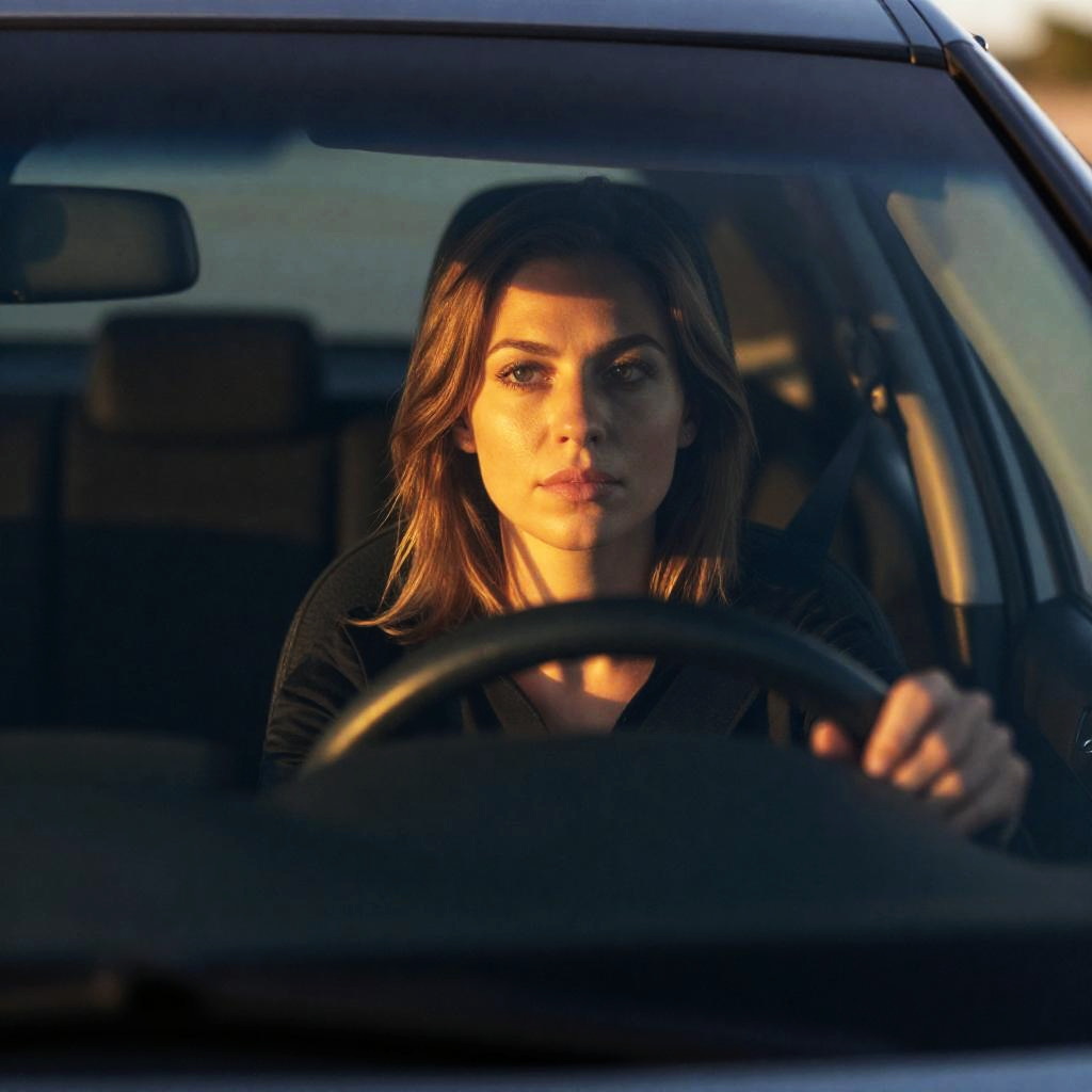 Photograph of a woman with fair skin and long brown hair, wearing red lipstick and a black top, sitting in a dark gray car. She grips the steering wheel with her right hand, looking forward with a neutral expression. Background includes a red and white vehicle.