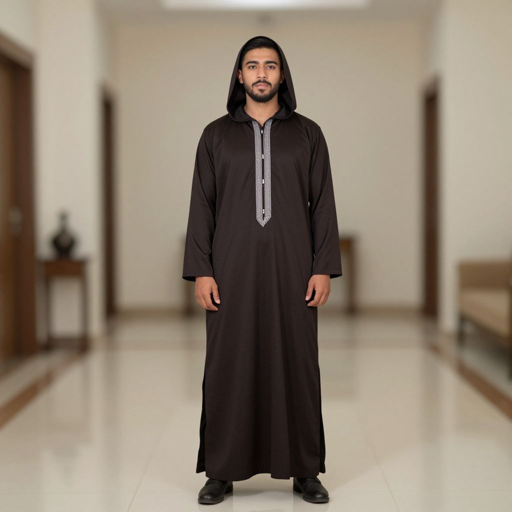 Muslim national costume, male focus, 1boy, facial hair, beard, looking at viewer, full body, standing, hood, hood up, mustache, solo, blurry, solo focus, indoors