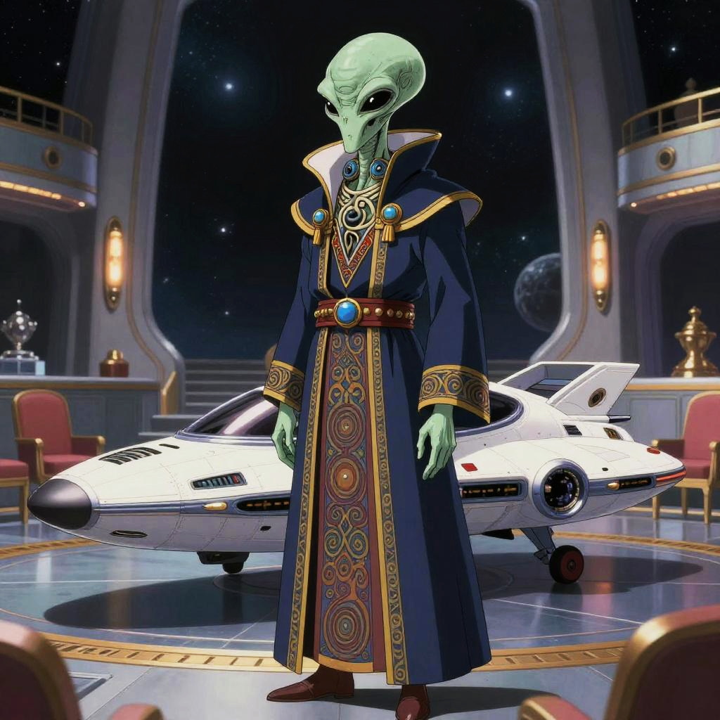 Realistic photo.a mysterious alien diplomat, wearing an elegant robe with intricate patterns, standing next to a luxurious spacecraft, in a grand cosmic council chamber, illustrated in the retro-futuristic anime style of Leiji Matsumoto. realistic photo