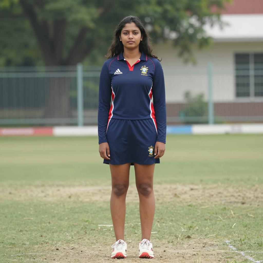 Cricket frock, photograph of a young woman standing on a cricket field, wearing a navy blue cricket dress with red and white trim, long sleeves, and a V-neck, on the chest, long dark hair, neutral expression, white and red cricket shoes, green grass, metal fence in background, trees and building partially visible, daytime, natural light, medium shot