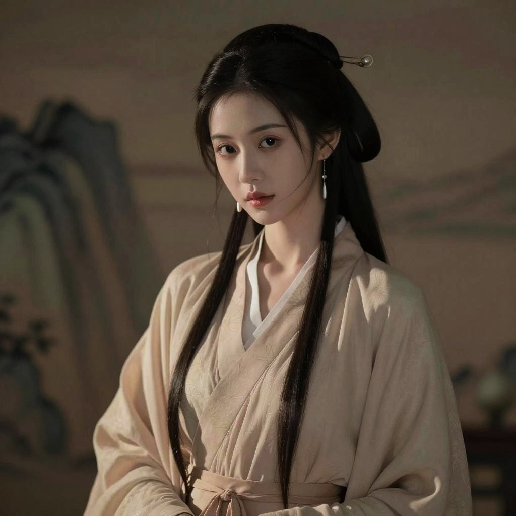 Masterpiece, best quality, 8k, cinematic light, ultra high res, 1girl, solo, looking at viewer, hanfu, black hair, earrings, upper body, closed mouth, chinese art, chinese painting