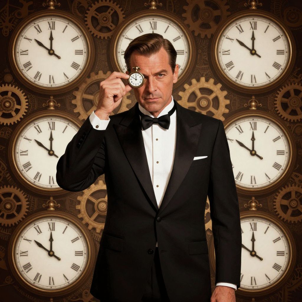 A digital illustration of a suave, middle-aged man with slicked-back brown hair, wearing a black tuxedo and bow tie, holding a pocket watch up to his eye. He's standing against a background of six large, vintage-style clocks and various interlocking gears, all in shades of brown and white. The overall style is steampunk, with a dramatic, slightly surreal lighting effect.
