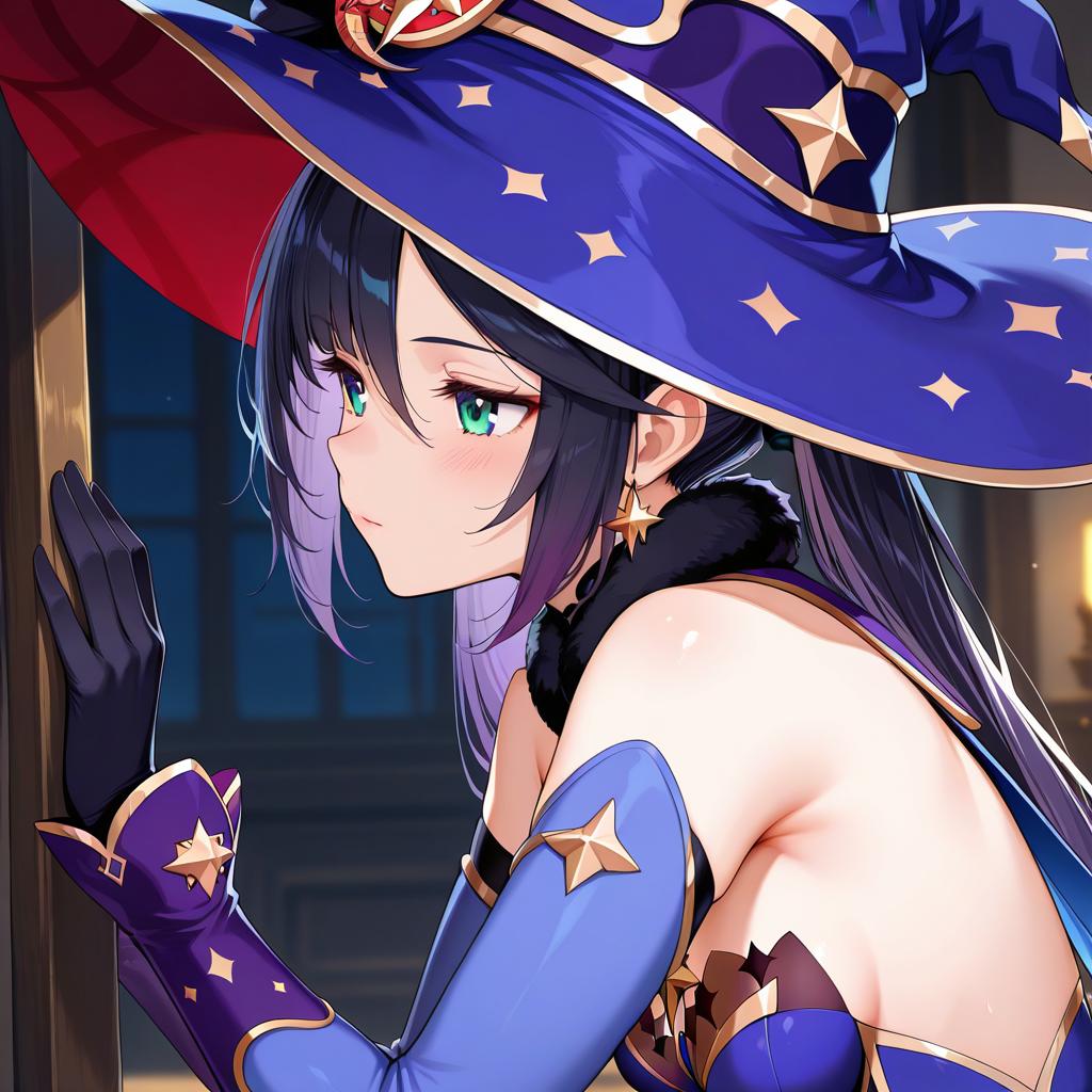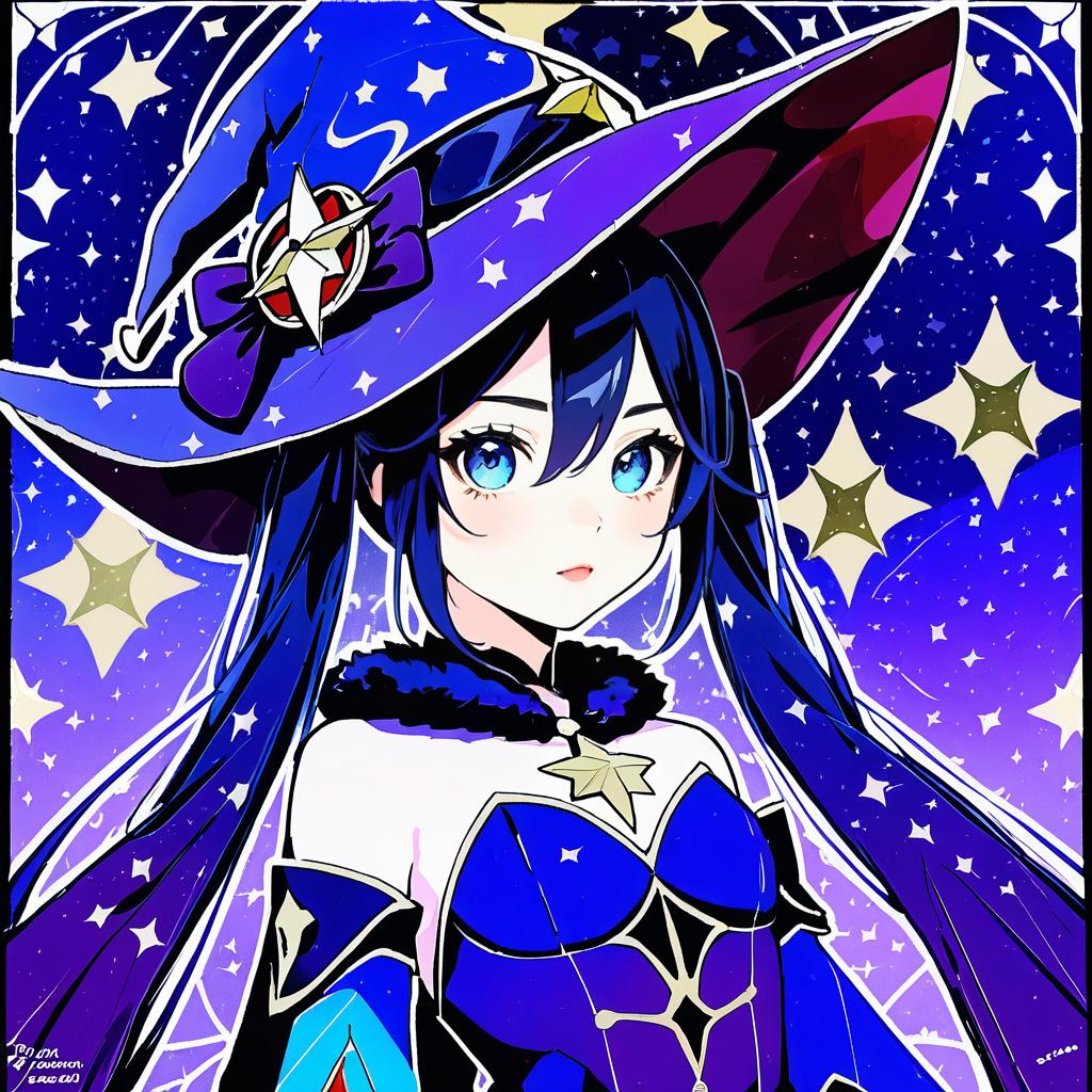 Mona (pact of stars and moon) (genshin impact), genshin impact, 1girl, green eyes, hair between eyes, blue eyes, long hair, black hair, purple hair, twintails, medium breasts, small breasts, witch hat, black gloves, blue headwear, detached sleeves, fur collar, long sleeves, by artist tokyo (great akuta), leet