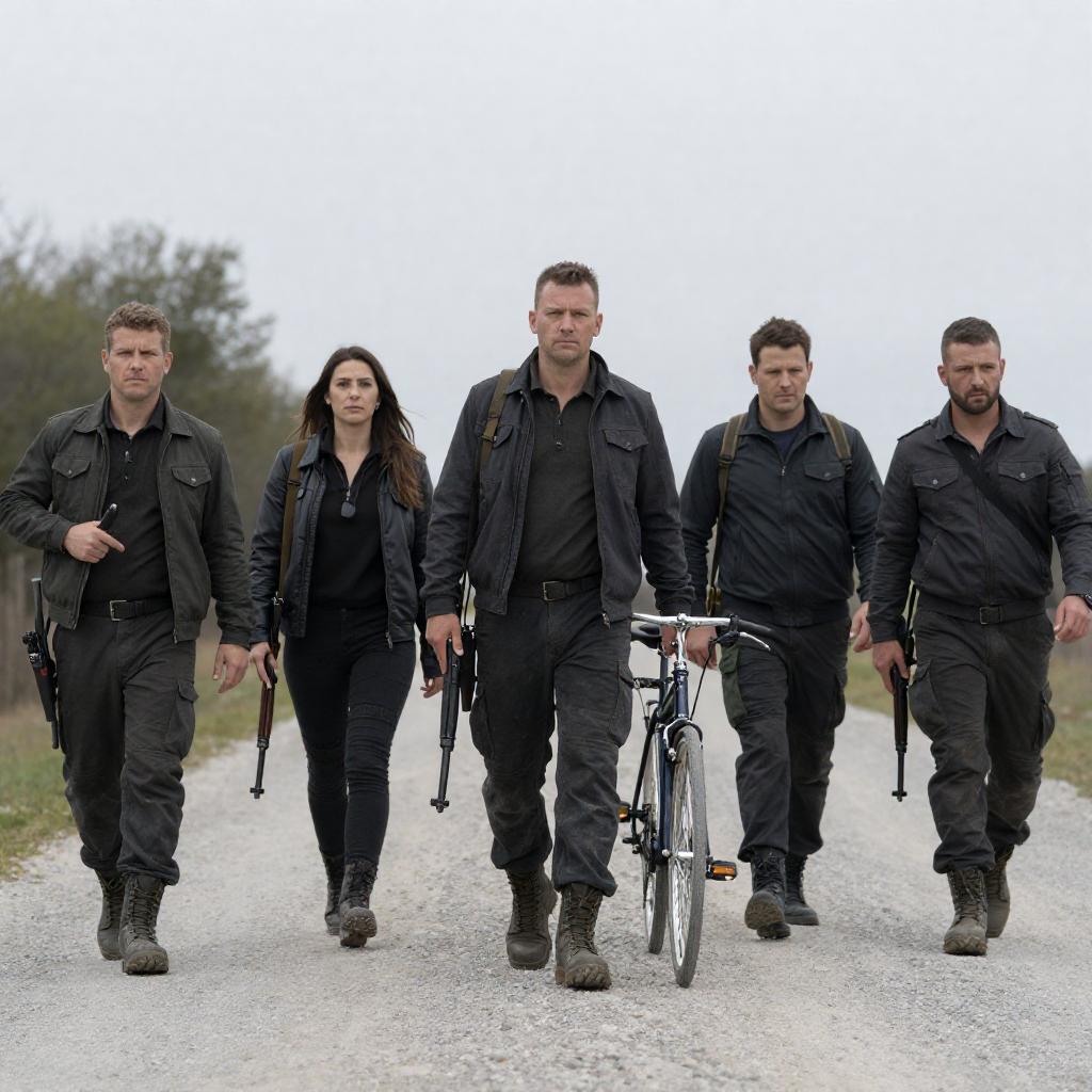 Photo of five armed people, consisting of three men and two women, walking confidently on a gray gravel road. They wear dark rugged clothing and boots, each carrying rifles. One man holds a bicycle. The sky is overcast with sparse trees in the background. All subjects have serious expressions.