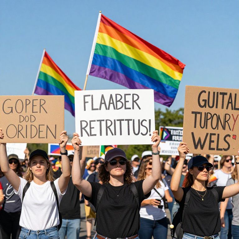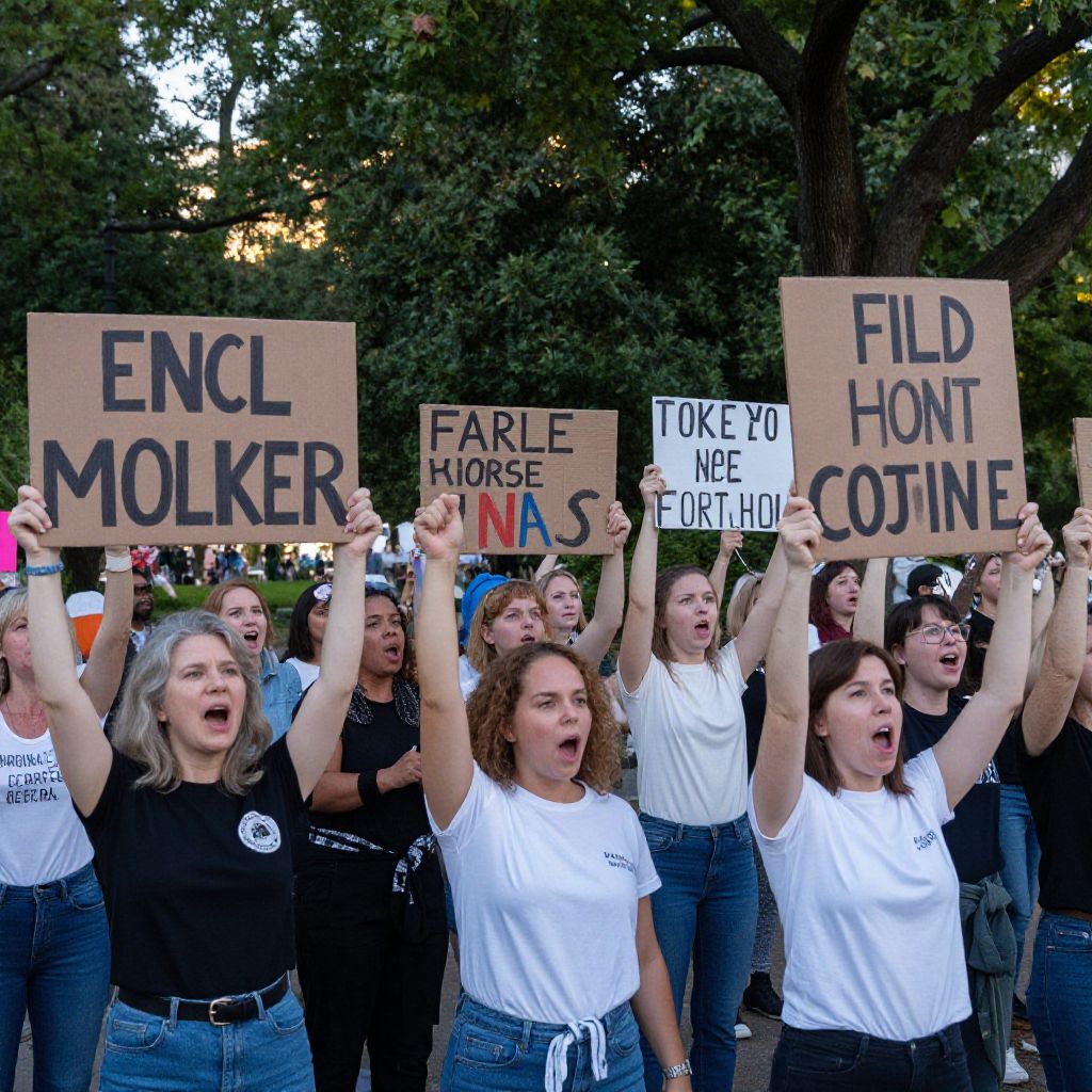 A crowd of women cheering passionately at a peaceful protest, holding handmade signs with empowering messages, diverse ages and ethnicities, set in a park with lush trees and soft evening light, conveying strength, solidarity, and hope.