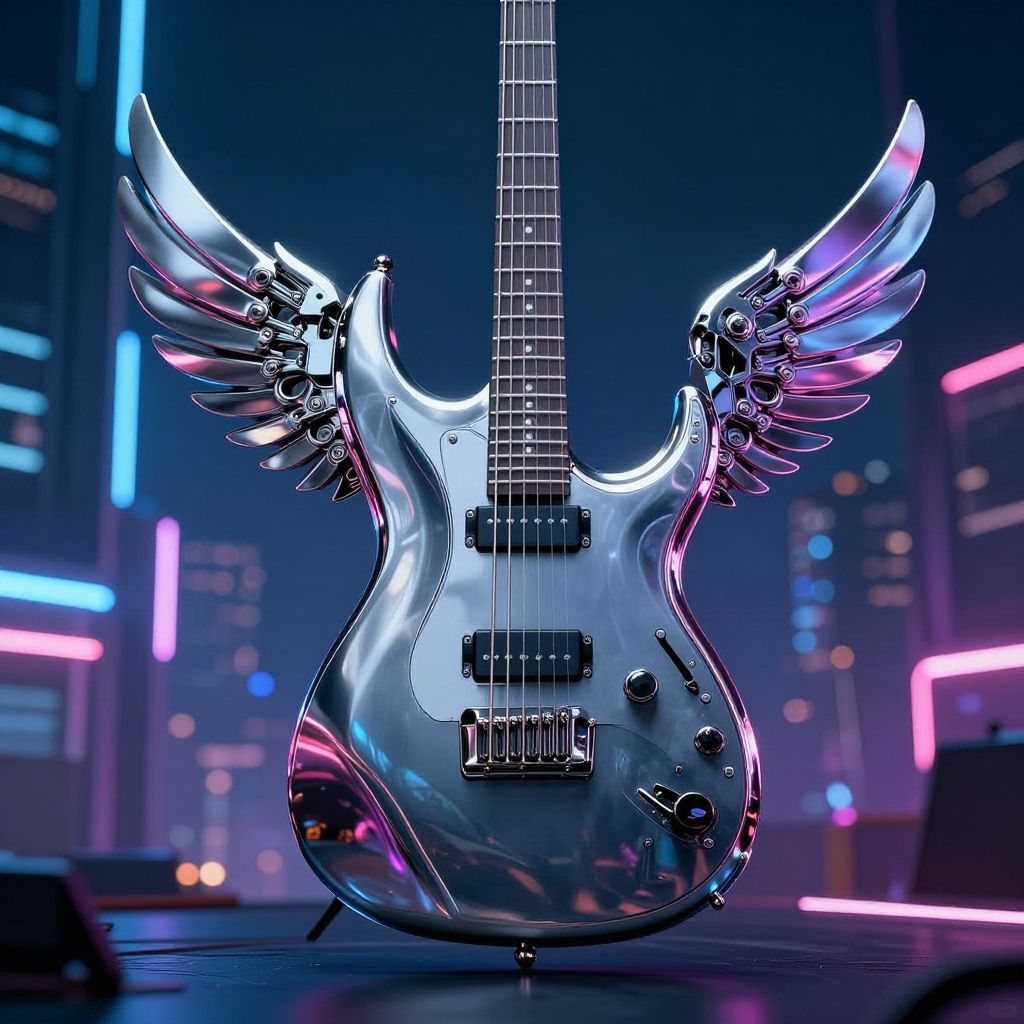 Futuristic electric guitar with mechanical wings unfolding, set against a cyberpunk cityscape at night, neon lights reflecting on chrome surfaces, high-tech and sleek design