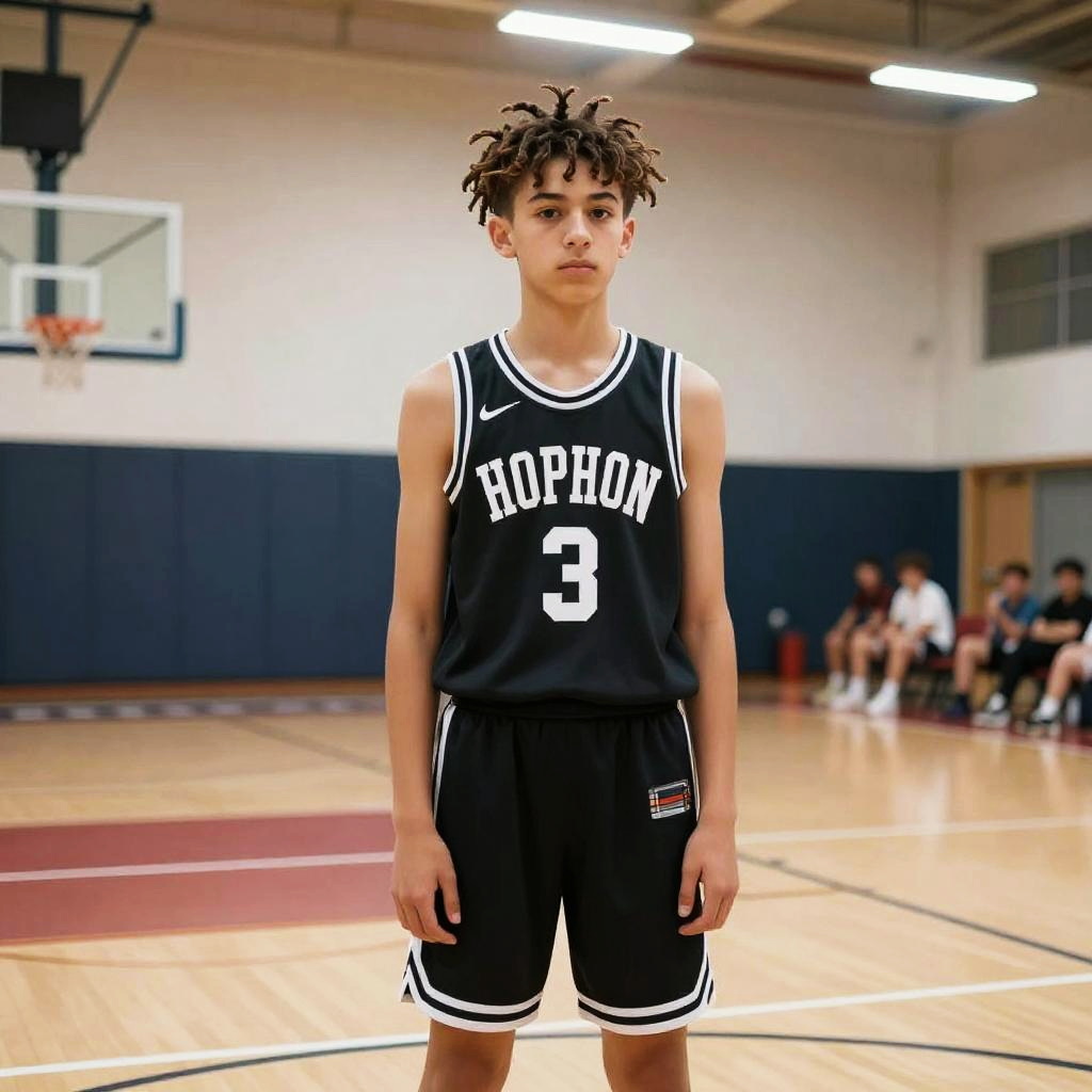 Mini Twists hairstyle on teenage boy, wearing basketball jersey and shorts, in indoor basketball gym, captured in fashion editorial style with fluorescent gym lighting.