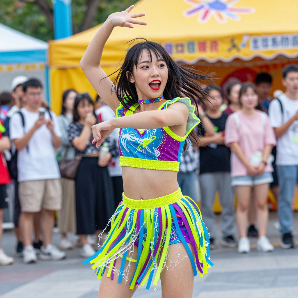 Colorful Asian woman dancing energetically in a vibrant, neon-striped crop top and skirt at an outdoor festival, with a yellow tent and crowd in