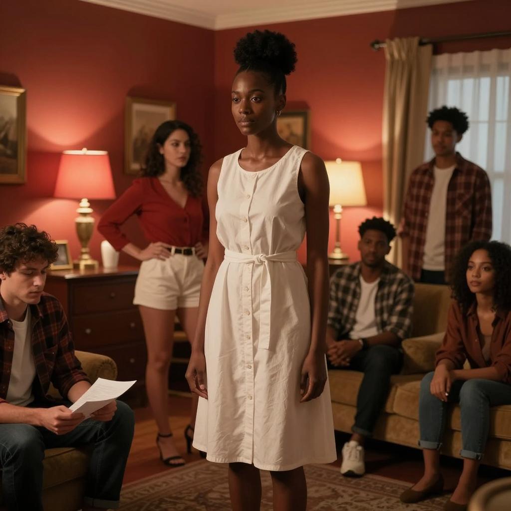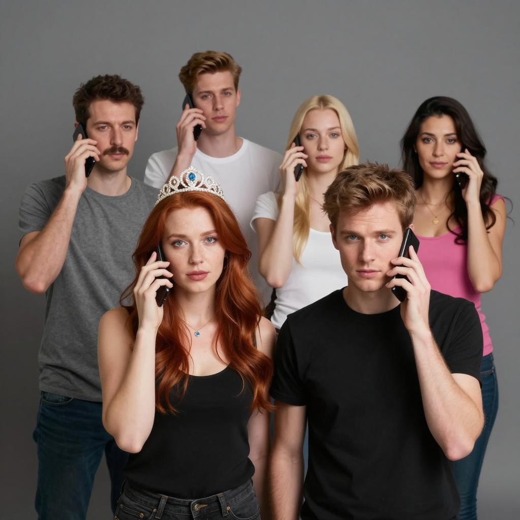 Group photo with a central close-up of a light-skinned woman with shoulder-length blonde hair and pink lipstick. Surrounding her are ten people of various ethnicities. They wear casual clothing: denim, leather jackets, and plaid shirts. Black background. Intense facial expressions. Woman in foreground has direct gaze. Group members in background have varied expressions.