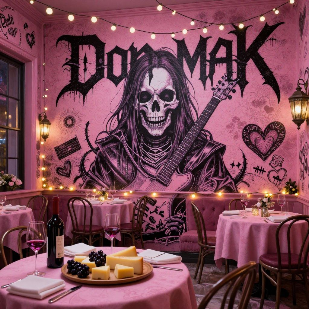 DonMD347hM374lXL DonM51ckXL, (masterpiece, best quality, detailed light), pink, street art, 2D, death metal, valentines day, romantic, cozy, string lights, wine and cheese platter, charming bed and breakfast, elegant dinner at a fancy restaurant, fairy lights (highres, 4k, 8k, intricate detail, cinematic lighting, amazing quality, amazing shading, soft lighting, Detailed Illustration, wallpaper)