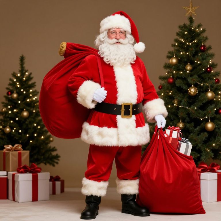 A cheerful figure embodies the spirit of Christmas, dressed in a traditional Santa Claus outfit complete with a red coat, white fur trim, and a large sack filled with gifts. He stands confidently amidst decorated presents and a Christmas tree, exuding warmth and joy, perfect for holiday-themed visuals.