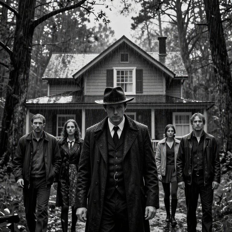 Family a movie poster for a noir black and white film about a mysterious detective trapped in a house in the middle of the forest in a rainy day, epic, cinematic, 8k, photoreal,