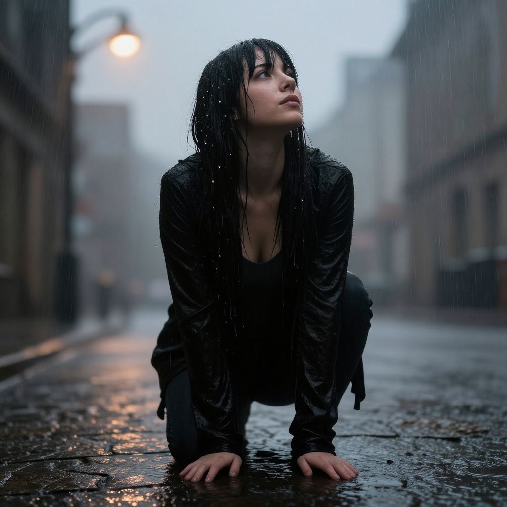 Photograph of a young woman with wet, dark, shoulder-length hair, kneeling on a rain-soaked, cobblestone street. She wears a black, wet jacket with a deep neckline revealing a hint of cleavage and black pants. Her hands are placed on the ground in front of her, and she gazes upward with a contemplative expression. The background is blurred, featuring dim streetlights and misty, overcast urban buildings. Raindrops are visible on her hair and jacket, and the street glistens with moisture. The overall mood is moody and atmospheric, with a focus on her intense, melancholic gaze and the wet, reflective texture of the street.